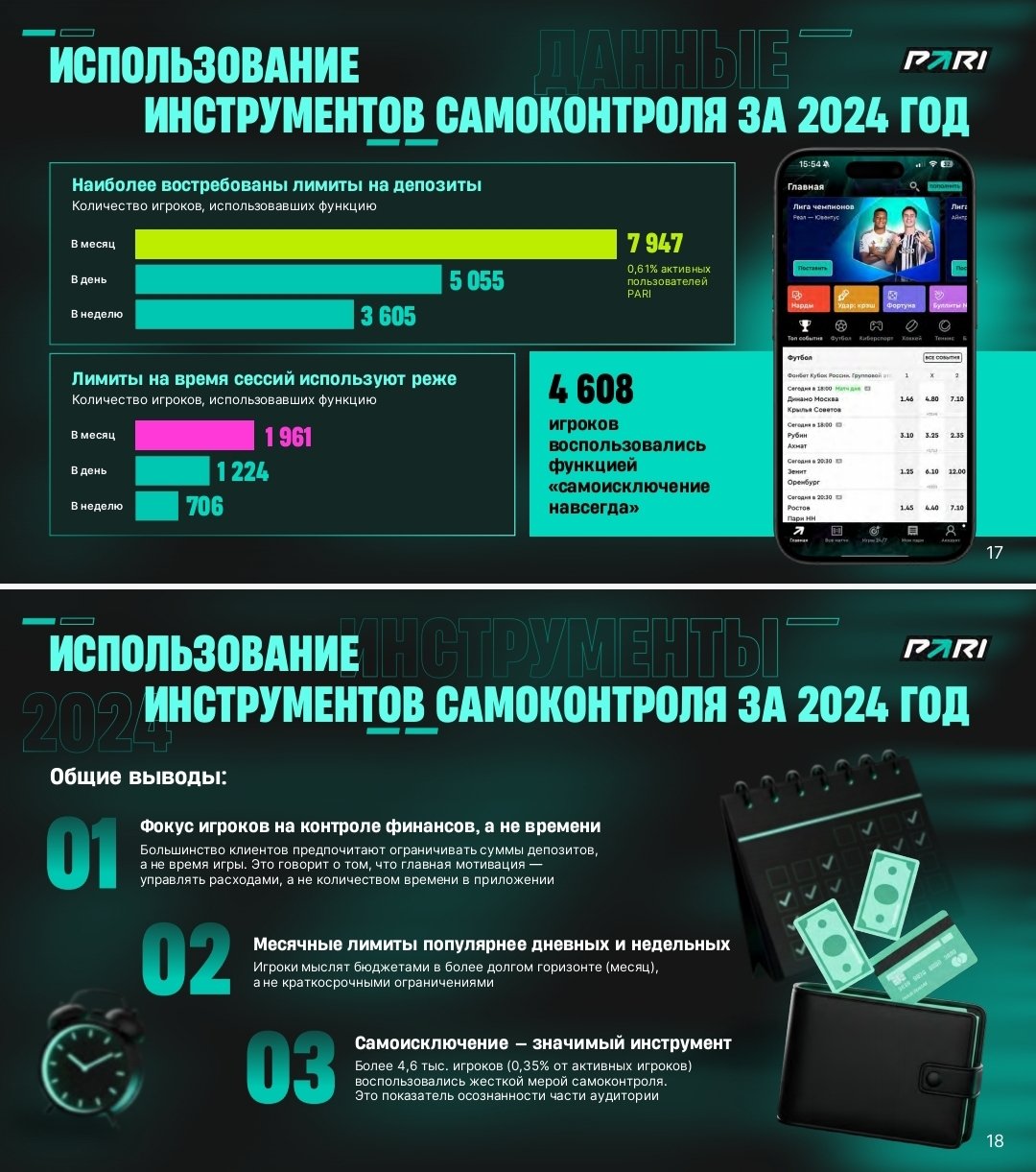 почти 7 947 клиентов компании в 2024 году установили лимиты на депозиты в месяц — это 0,61% активных игроков БК PARI;