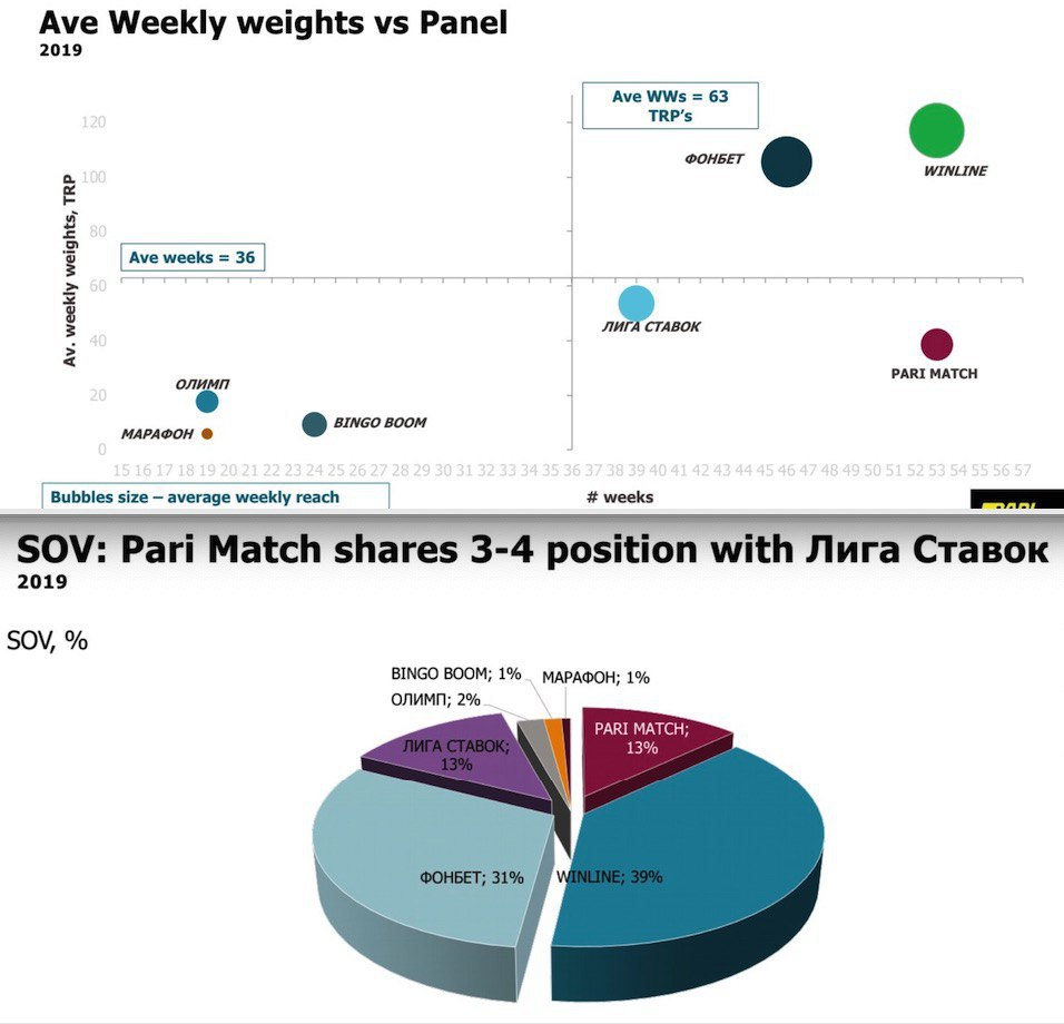 Париматч имеет такие высокие показатели по количеству недель присутствия из-за спонсорства ежедневной вечерней программы «Все на Матч» на Матч-ТВ в 2019 году.