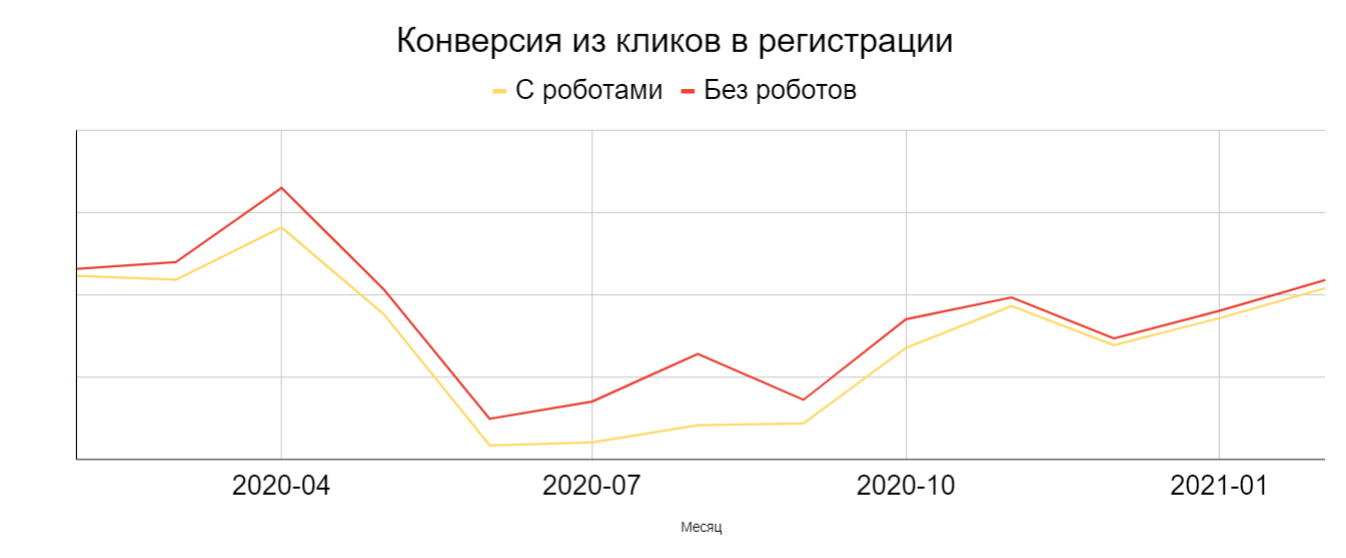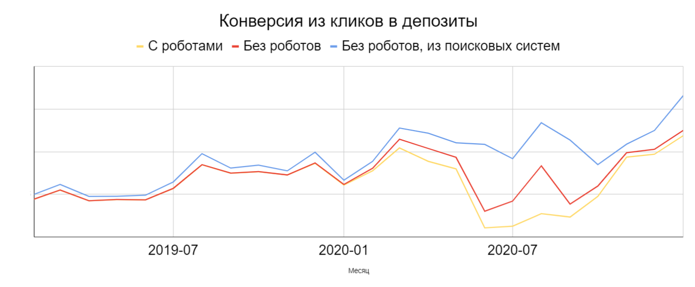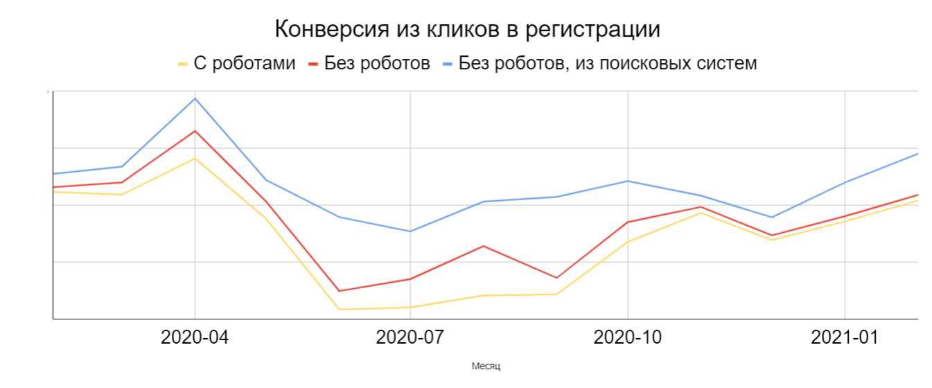 На этом графике конверсия в период весна — лето 2020 года действительно серьёзно упала — в 16 раз. Но если применить сегмент «роботность — люди», то падение составит уже 5,6 раза.