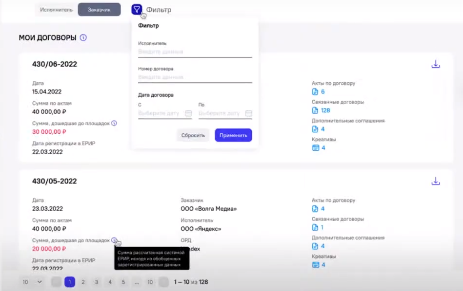 Следить за исполнением будут на основе договоров и актов с указанием общей цены и разбивкой по стоимости для отдельной услуги по каждому креативу. Всё это тоже нужно передавать в ЕРИР. Теперь рекламораспространителям обязательно нужно заключать договоры с ОРД, правда, выбор ОРД — это уже прерогатива самого субъекта правоотношений.