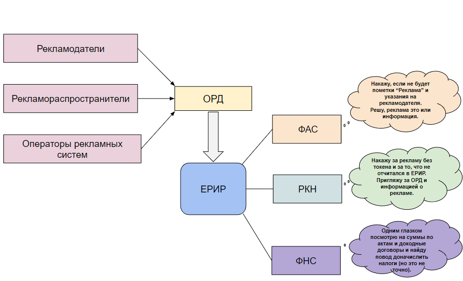 Абсолютно все креативы (от баннеров на сайтах до роликов на видеохостингах) должны быть промаркированы специальной отметкой «Реклама» и содержать информацию о рекламодателе и/или ссылку на его официальный сайт, а также иметь erid — тот самый токен-идентификатор. Благодаря этому участники рынка и контролирующие органы смогут получить из ЕРИР информацию о всей цепочке распространения рекламы. Главным образом взаимодействие будет происходить между рекламодателем, рекламораспространителем и ОРД. После вступает Роскомнадзор, который, помимо хранения данных, будет отслеживать всю поступающую информацию наряду с ФАС и, скорее всего, ФНС.
