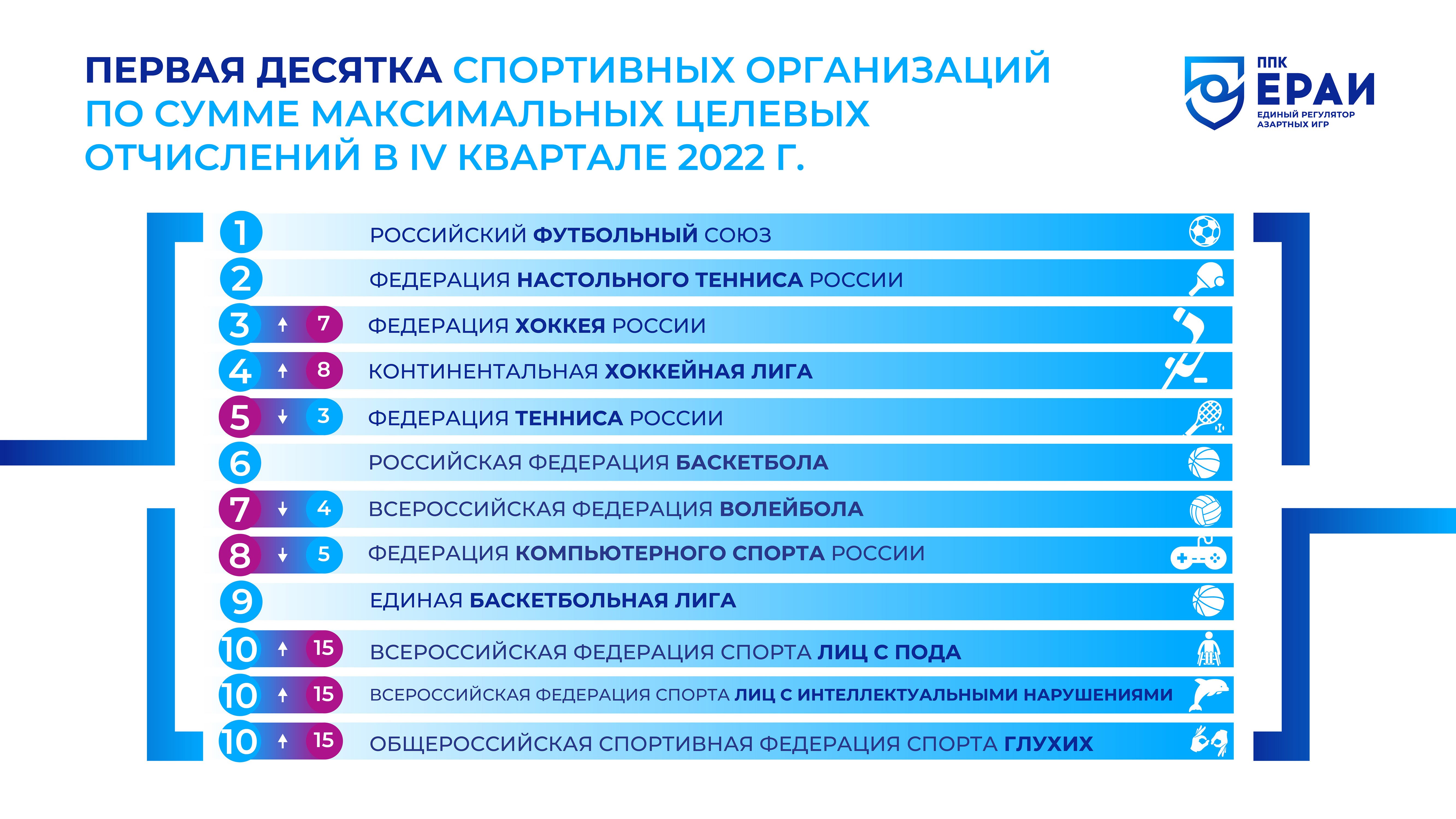 «Единый регулятор азартных игр» отчитался об итогах 2022 года для российских букмекеров. Целевые отчисления, федерации-лидеры, объём рынка и тройка крупнейших БК — в главном релизе ЕРАИ.