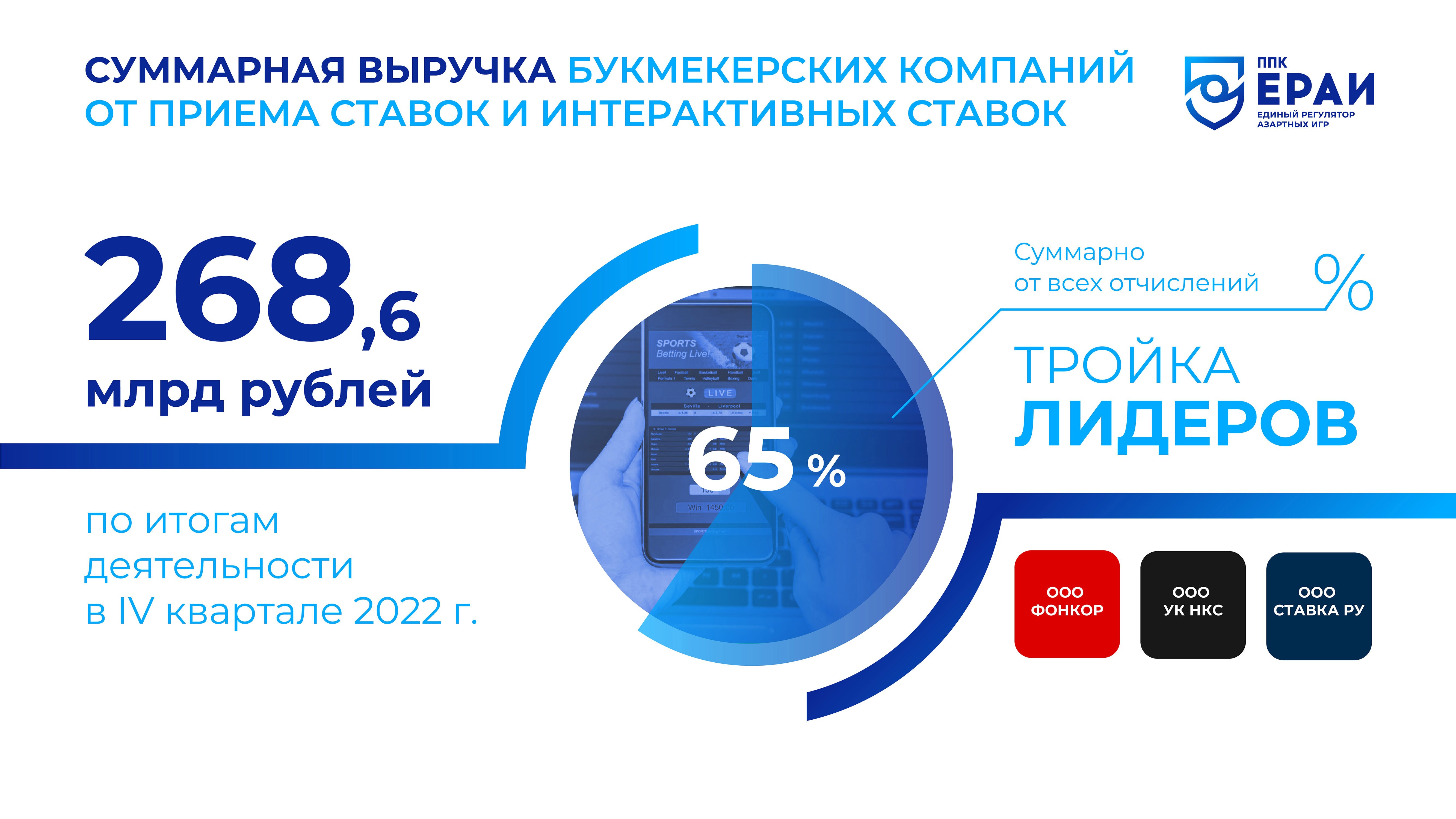 Суммарная выручка букмекеров от приёма ставок в 2022 году составила 879,3 миллиарда рублей. Компании «Фонбет», Winline и «1хСтавка» сохранили лидерство: их суммарная доля на рынке составляет 65% (268,6 миллиарда рублей). В 4-м квартале они выплатили целевых отчислений на 2,66 миллиарда.