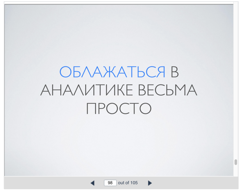 Последовательно разгребая завалы закладок, я на днях добрался до отличной презентации: «Продуктовая аналитика — Карго Культ в современных компаниях». Рекомендую изучить всем, кто как-то связан с веб-аналитикой, работой с конверсиями или интерфейсами. Очень хорошо помогает настроиться на правильный подход.