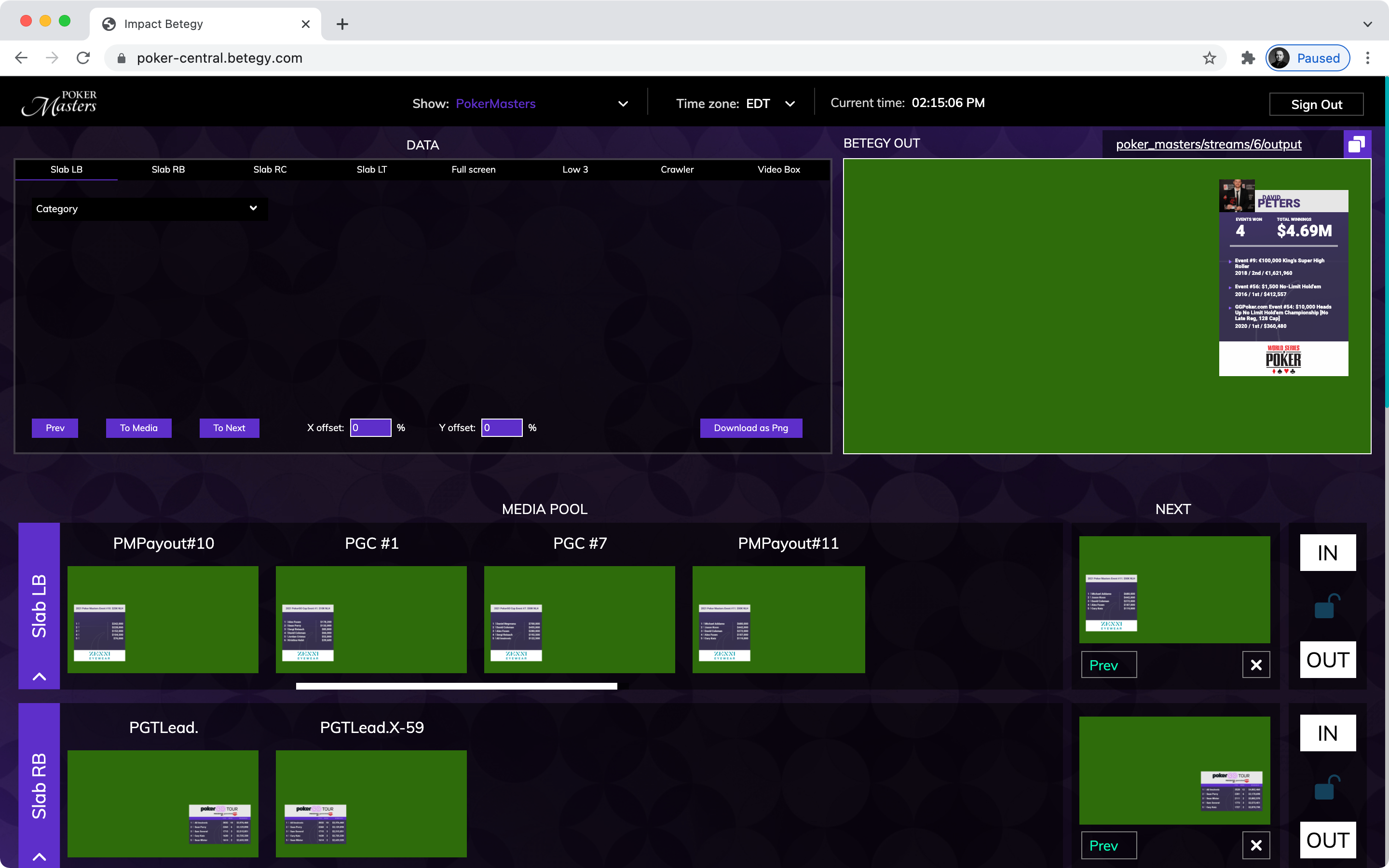 Так вот мы берём ту же технологию, которую использовали для всех наших других продуктов, и в реальном времени подключаемся к базам данных. Например, идёт разговор за покерным столом, надо быстро показать статистику конкретного игрока (для этого она должна была быть заранее сгенерирована до нашего решения). С помощью нашего решения в реальном времени можно зайти, выбрать игрока, нажать «Сгенерировать» — и инфа сразу пойдёт в эфир.