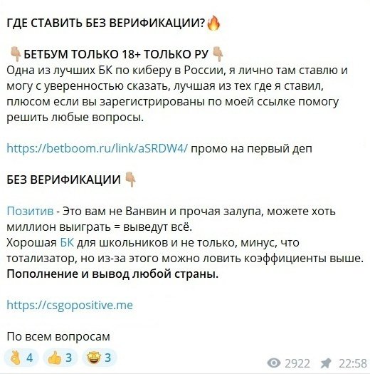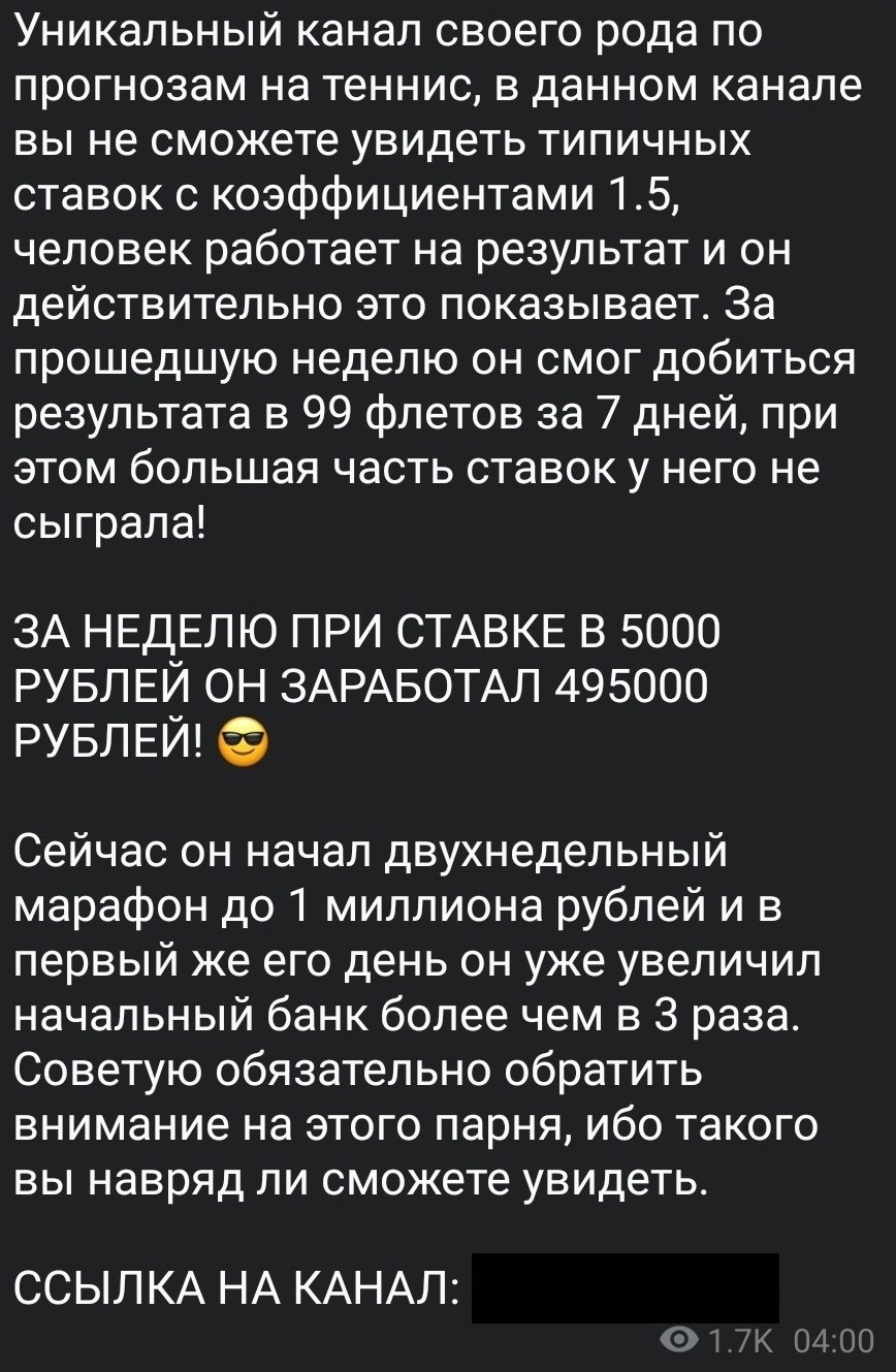 Нет ничего плохого в том, чтобы брать деньги от букмекерских контор, особенно если речь о бесплатных каналах. Но концентрация скама среди рекламы говорит об отношении каппера к деньгам своих подписчиков: если советует г*вно-бука, который точно не заплатит, то кинет и с продажей после оплаты, VIP-рассылки и прочего.