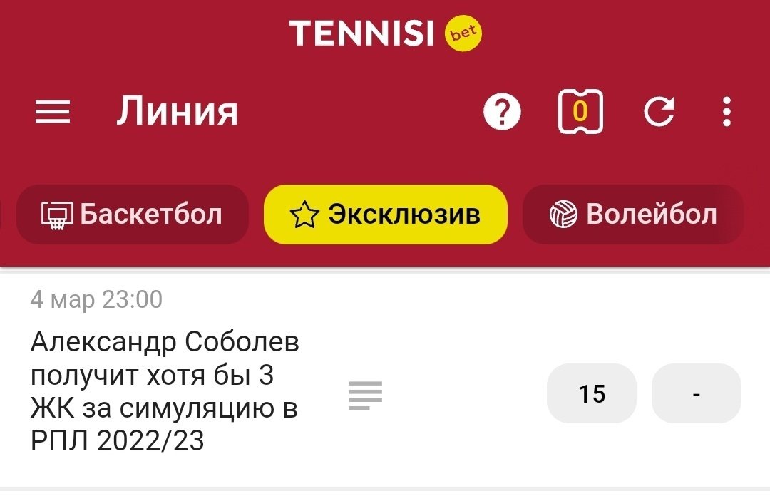 Но и для главных европейских турниров на клубном уровне есть масса интересных предложений: статистика конкретной команды или спортсмена, пари на продолжительность победной серии и так далее... Мой личный фаворит — это количество жёлтых карточек Александра Соболева за симуляцию от Tennisi.