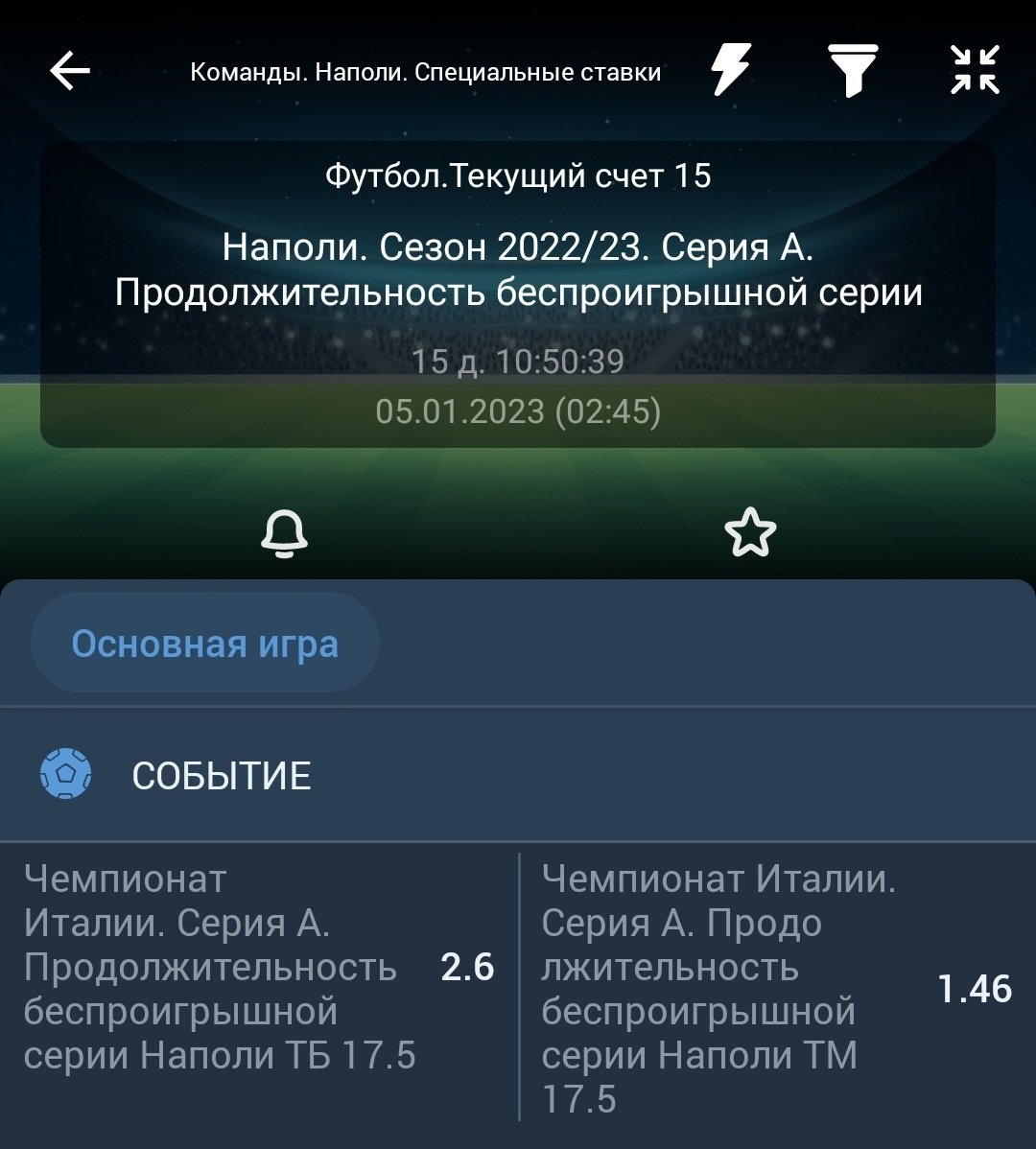 Да-да, поставить можно, например, что беспроигрышная серия «Наполи» продлится как минимум 18 матчей, и получить расчёт уже через 3 тура Серии А. А если заряжать на ТМ 17,5 игр без поражений, то пари может выиграть уже в следующем туре — там неаполитанцев ждёт выезд к «Интеру».