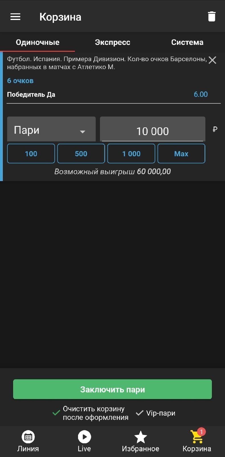 Лимиты не космические, но достаточно играбельные: на 6 очков дадут поставить ровно 10 тысяч рублей, на 3 очка — около 20 тысяч.