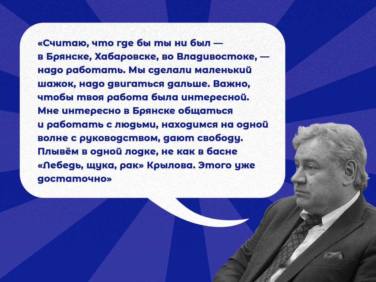 «Я считаю, что где бы ты ни был — в Брянске, Хабаровске, во Владивостоке, — надо работать. Мы сделали маленький шажок, надо двигаться дальше. Важно, чтобы твоя работа была интересной. Мне интересно в Брянске общаться и работать с людьми, находимся на одной волне с руководством, дают свободу. Плывём в одной лодке, не как в басне “Лебедь, щука, рак” Крылова. Этого уже достаточно», — сказал Канчельскис.