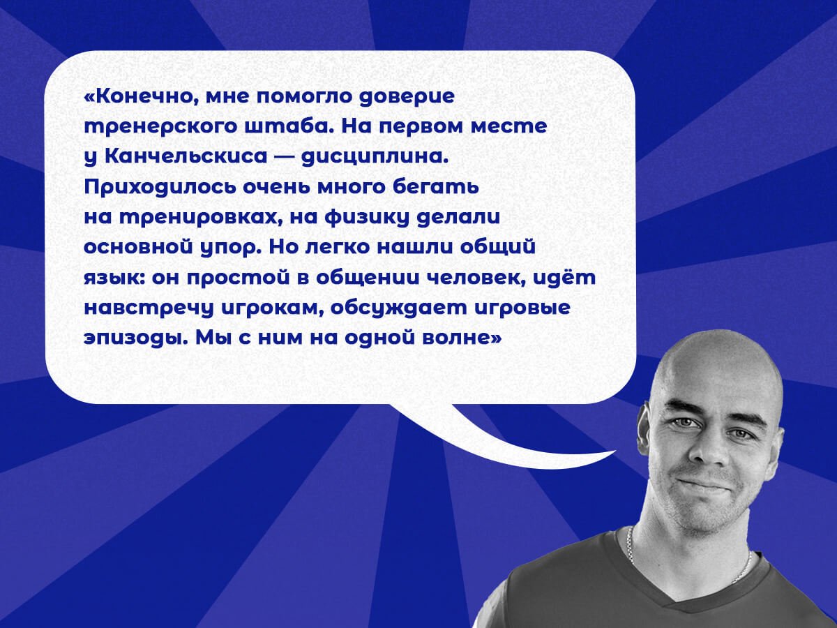 «Конечно, мне помогло доверие тренерского штаба. На первом месте у Канчельскиса — дисциплина. Приходилось очень много бегать на тренировках, на физику делали основной упор. Но легко нашли общий язык: он простой в общении человек, идёт навстречу игрокам, обсуждает игровые эпизоды. Мы с ним на одной волне», — делится Дрогунов.