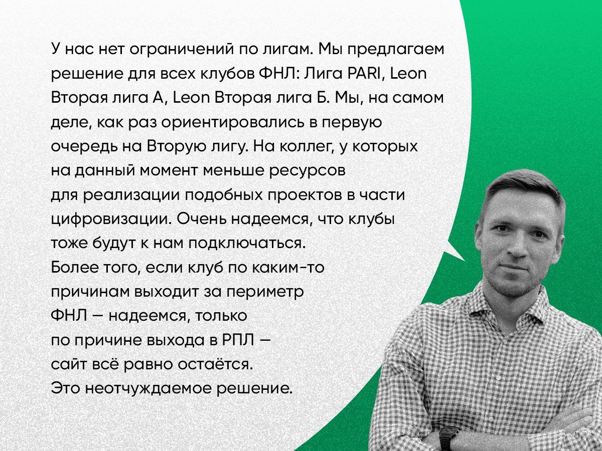 Ефимов: У нас нет ограничений по лигам. Мы предлагаем решение для всех клубов ФНЛ: Лига PARI, Leon Вторая лига А, Leon Вторая лига Б. Мы, на самом деле, как раз ориентировались в первую очередь на Вторую лигу. На коллег, у которых на данный момент меньше ресурсов для реализации подобных проектов в части цифровизации. Очень надеемся, что клубы тоже будут к нам подключаться. Более того, если клуб по каким-то причинам выходит за периметр ФНЛ — надеемся, только по причине выхода в РПЛ — сайт всё равно остаётся. Это неотчуждаемое решение.