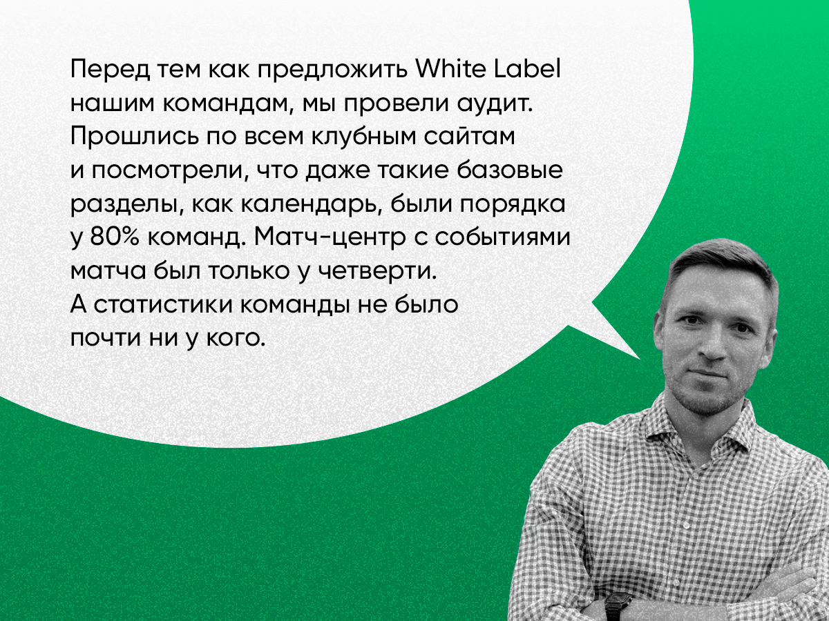 Перед тем как предложить White Label нашим командам, мы провели аудит. Прошлись по всем клубным сайтам и посмотрели, что даже такие базовые разделы, как календарь, были порядка у 80% команд. Матч-центр с событиями матча был только у четверти. А статистики команды не было почти ни у кого.