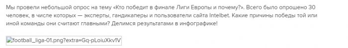 Мы провели небольшой опрос на тему «Кто победит в финале Лиги Европы и почему?». Всего было опрошено 30 человек, в числе которых — эксперты, гандикаперы и пользователи сайта Intelbet. Какие причины победы той или иной команды они считают главными? Делимся результатами в инфографике!