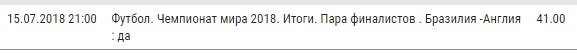 Очень вкусный и вполне реалистичный вариант предлагается выбрать на финал как таковой. В том смысле, кто этот «дуэт» в конечном итоге таки составит. Опять же, сетка соревнования составлена таким образом, что вероятность прохождения таких коллективов, как Бразилия и Англия, на фоне других возможных вариантов, более чем высока. На мой взгляд, с учетом демонстрируемой командами игры выход Бразилии и Англии в финал – неплохая перспектива для прогноза. Как бы непредсказуемым этот турнир не был…