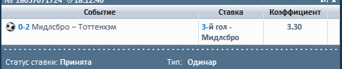 Особенность этого матча история команд, в которой гости редко побеждают. Неудачи на старте ярко выражают слабость атаки Мидлсбро, но отнюдь не защиты. В хороший день и настроении Мидлсбро может запросто сыграть и всухую. Тоттенхэм –сила, но главная забота, как разорваться на ЛЧ и Премьеру. В ЛЧ поражение от Монако на своем поле заставляет искать победы в Москве против ЦСКА иначе процесс вылета из ЛЧ станет необратимым. На мой взгляд придется Тоттенхэму пожертвовать игрой с Мидлсбро, чтобы добиться успеха в России. Кефы: 4.00-3.50-1.95, с учетом таких размышлений непроигрыш Мидлсбро выглядит привлекательно, есть валуй в истории и потери важного нап. Кейна и защ. Роуз , серьезно влияют на команду.