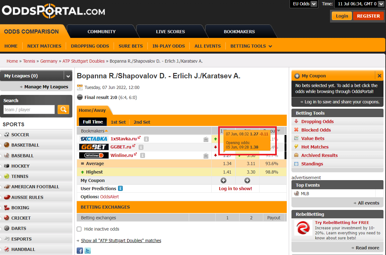 Однако какого-либо аномального прематч-движения коэффициентов в том событии не было: утром 5 июня в российских конторах линия открылась с 1.38 на победу Бопанны и Шаповалова, а закрылась через двое суток, утром 7 июня, с 1.27. Матч все 48 часов не снимали с приёма, то есть букмекеры не замечали ничего необычного.