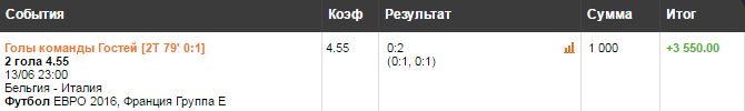 У бельгийцев преимущество во всех линиях. Полагаю, быстрые и техничные игроки атаки Бельгии сегодня должны не раз огорчить медленных защитников Италии, а вариант с двумя голами бельгийцев с кф чуть больше 2.5 мне показался довольно скромным. Поэтому я предлагаю вам такой вариант. Кф просто шикарен, а заход вполне вероятен. Надеюсь, я доходчиво преподнес ход своих мыслей.
