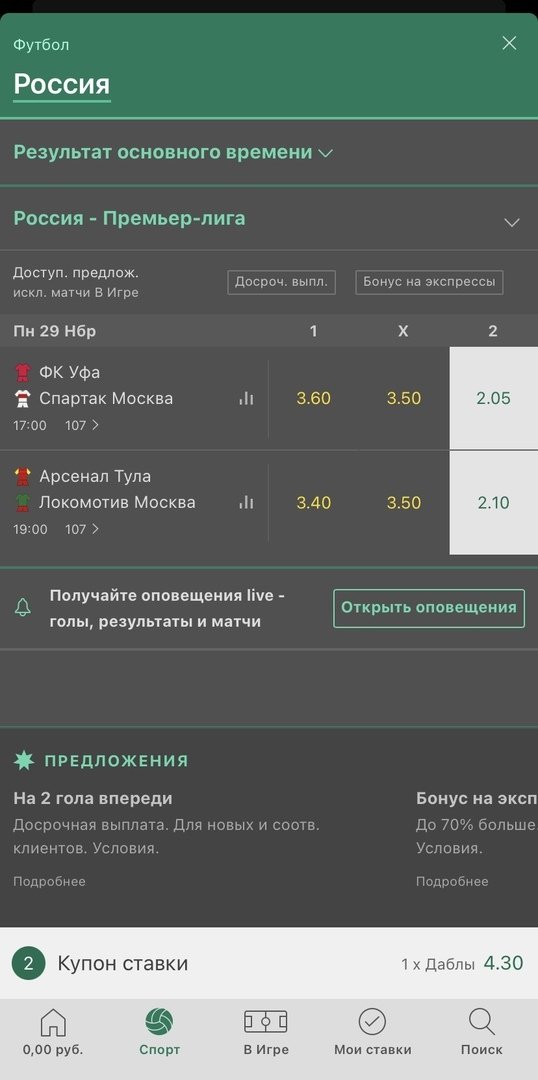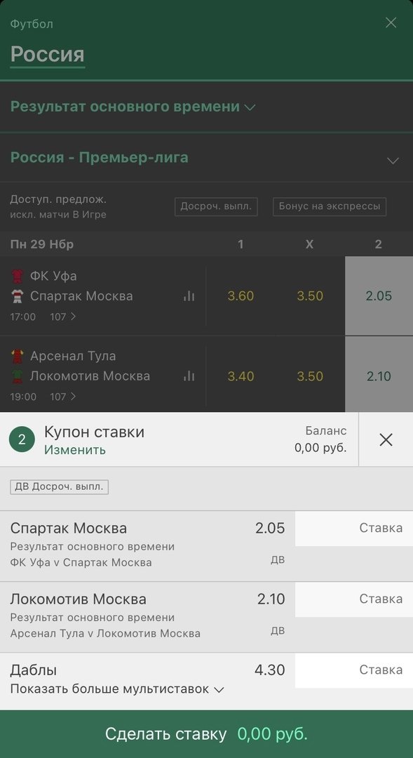Чтобы заключить пари, нужно кликнуть на один или несколько интересующих коэффициентов, нажать на значок купона внизу страницы, ввести сумму и подтвердить ставку.