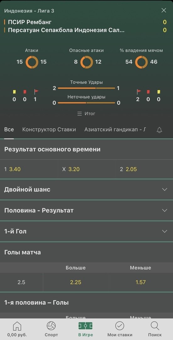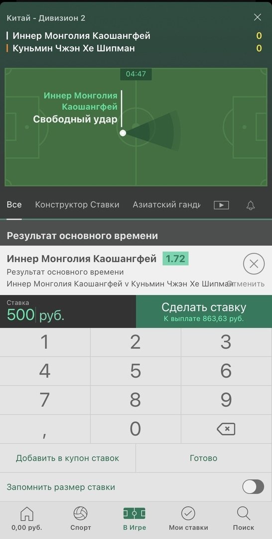Ставка в лайве — всего четыре клика: на событие, на коэффициент, на поле с суммой ставки, на «Сделать ставку». Просто, быстро — зачёт.