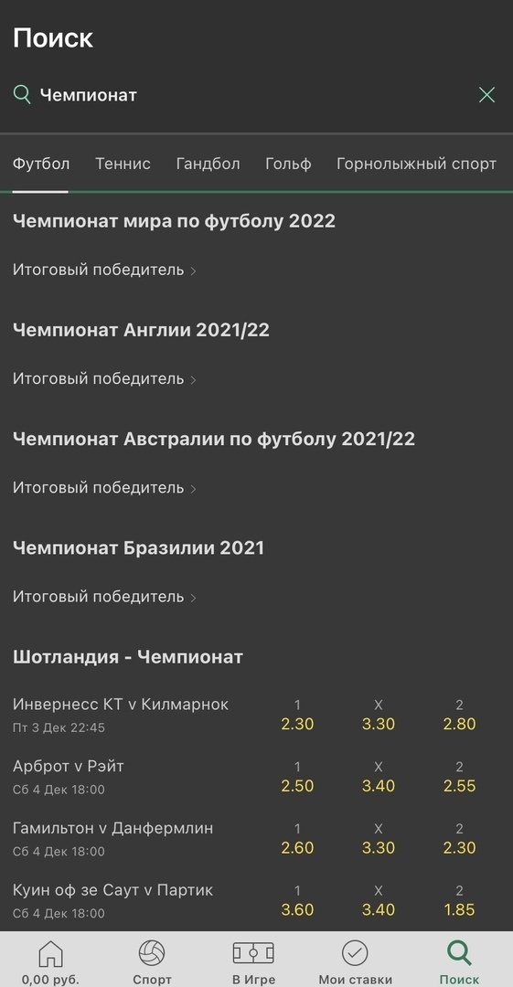 Меню с разделами «Спорт», «В игре» и «Мои ставки» перенесли в нижнюю часть экрана, что заметно разгрузило верхнюю, где остались личный кабинет, актуальные акции и интерактивная строка с выбором видов спорта.