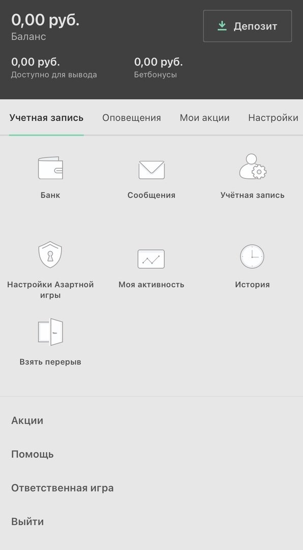 Личный кабинет ничем не отличается от мобильной версии сайта. Всё тот же функционал, но только не в странном окошке, а на полноценной странице: можно изменить интерфейс (только язык и часовой пояс), ознакомиться с действующими акциями, настроить ответственную игру и далее по списку.