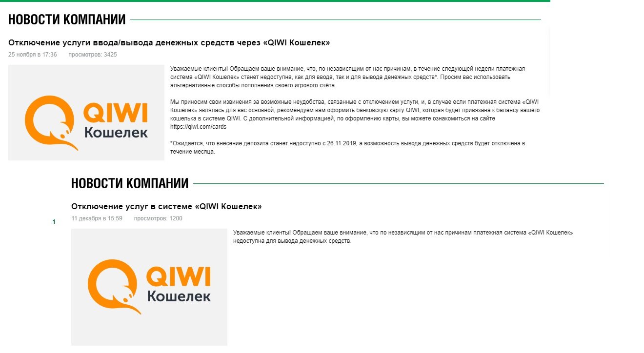 Ранее на офшорном сайте букмекера появилось сообщение о том, что приостанавливаются выплаты на Qiwi-кошелек, так как платежная система перестала обрабатывать транзакции с нелегальных букмекерских контор.