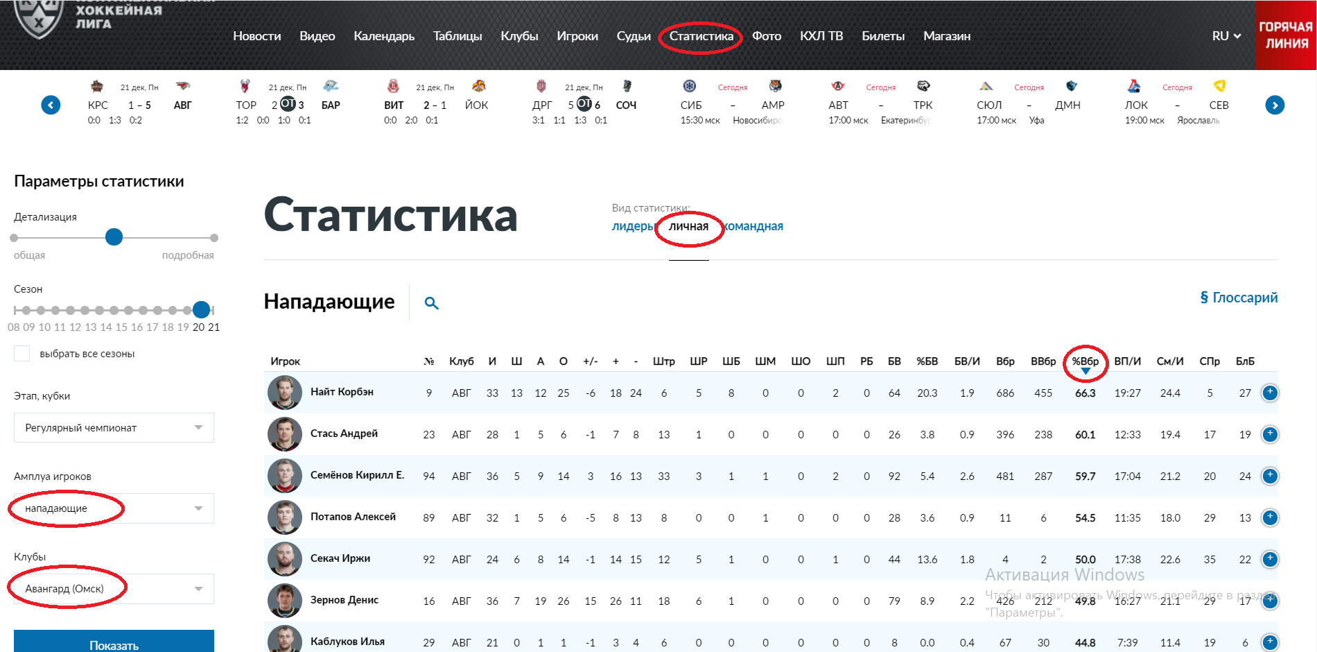 Смотреть статистику можете на сайте лиги - https://www.khl.ru/. Откройте раздел "Статистика", далее перейдите в "Личная", а потом используйте фильтр слева, чтобы выбрать амплуа (нападающие) и команду. Выигранные вбрасывания - графа "%Вбр", а при нажатии на надпись игроки сортируются от лучшего к худшему и наоборот. В целом это довольно быстро.