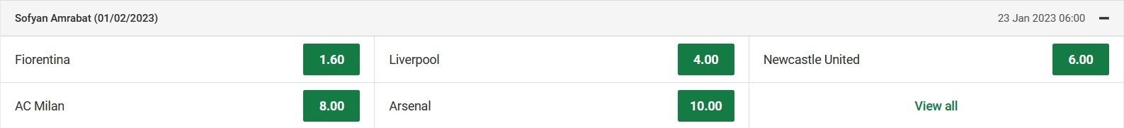 Дальнейшую судьбу Софьяна стали связывать с английскими топами, среди которых самым заинтересованным кажется «Ливерпуль» — мерсисайдцы готовы отказаться от притязаний на Беллингхема в зимнее трансферное окно ради перехода африканца. Правда, букмекеры пока в трансфер не особо верят: Unibet, например, даёт 4.00 на переход Амрабата в банду Клоппа.