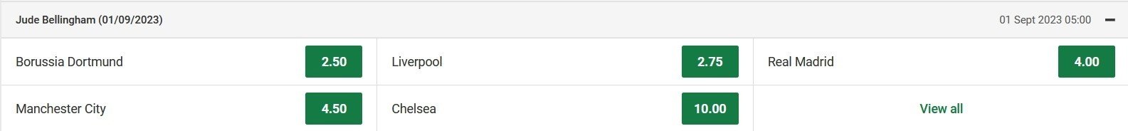 А вот аналитики в переход Беллингхема зимой вообще не верят, а летом ждут Джуда в «Ливерпуле»: 4.00 на переезд в Англию до 3 февраля (у «Реала» 12.00), и 2.75 на летний трансфер (у Мадрида 4.00).