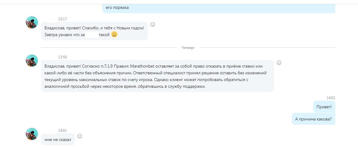 И еще есть вопрос такой: у вас не осталось связей с каким-то адекватным представителем офшорной компании Марафон? Мне понизили лимиты там до 350 при игре только на ТОП-событиях, счет многолетний, совершено ставок в истории свыше 9000, средний размер каждой был высок - от 10000 точно (были и по 50000, и по 100000, и по 200000 с лишним), ежели не считать время частичной порезки. Есть подозрение, что на самом деле никто не пересматривает лимиты, операторы сидят, как в чате, так и по почте, присылая стандартные ответы...