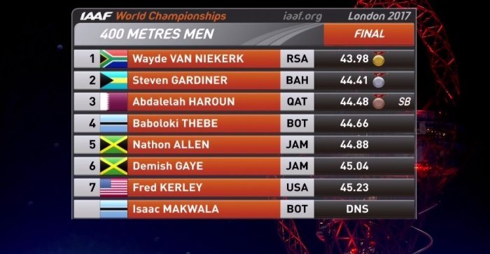 И вот Ван Никерк после всего этого приехал на чемпионате мира за золотом на 200 и 400 метров. Но пока на этом чемпионате так слаживается, что победители в спринте на Олимпийских играх в Рио пока проваливают этот чемпионат непосредственно в финале, так было уже и с Усейном Болтом и с Элейн Томпсон на 100 метров.