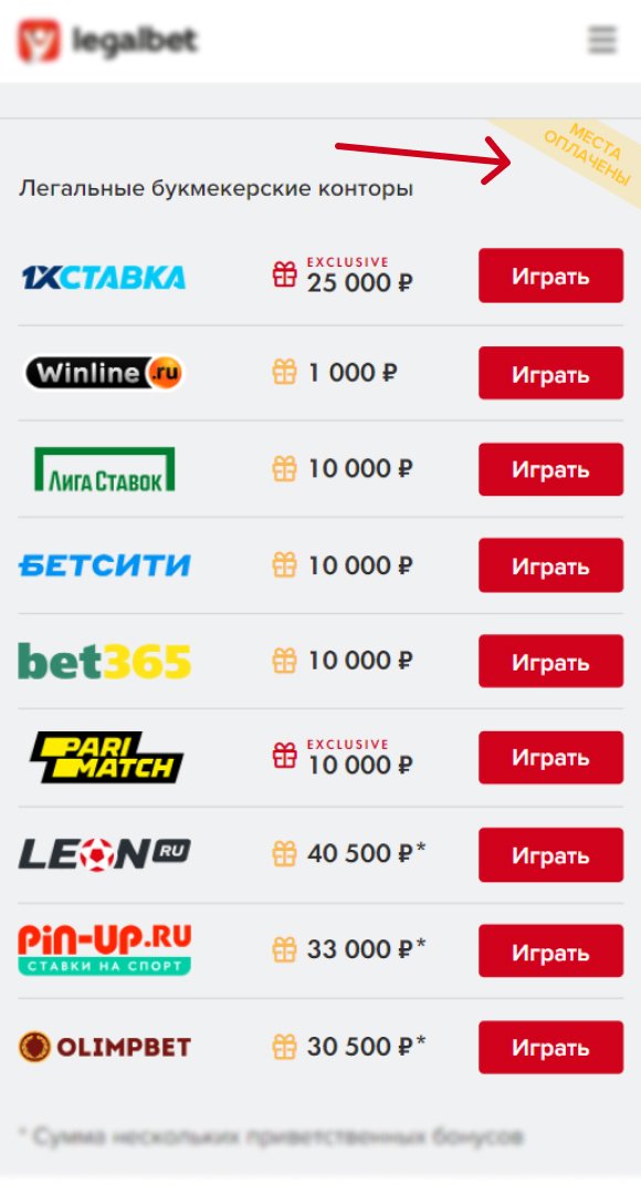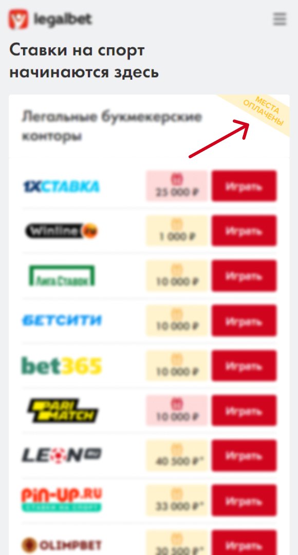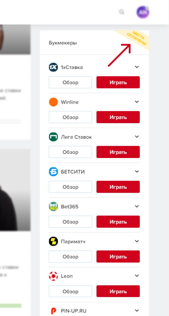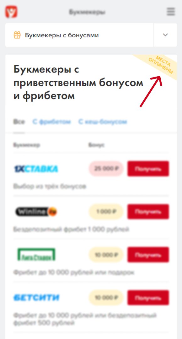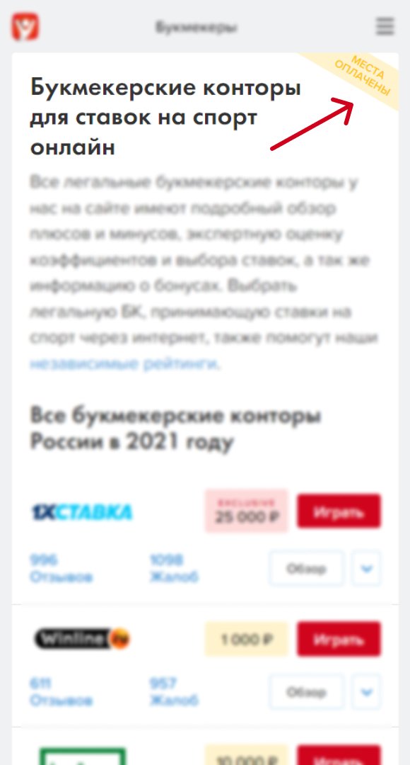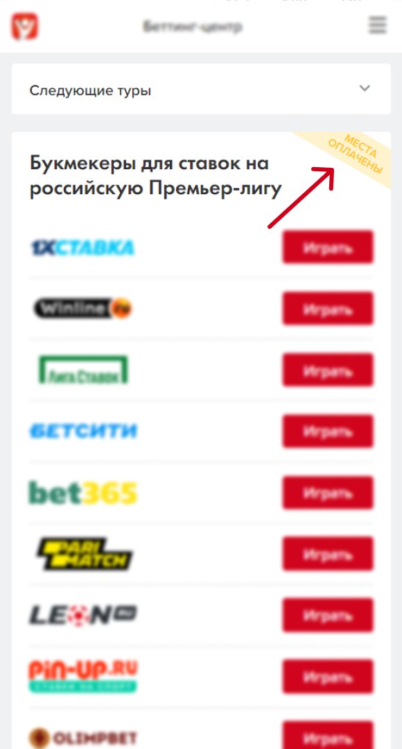 Список БК с плашкой «Места оплачены» можно увидеть во всплывающих окнах и на разных страницах сайта: в перечне легальных букмекеров России, в специальных рекламных блоках, разделах Беттинг-центра, в боковой и нижней частях сайта. Важно понимать, что позиции там в подавляющем большинстве случаев не продаются отдельно, а синхронизируются со списком на главной странице. Очень и очень редко расположение компаний в этих перечнях может отличаться от основного.
