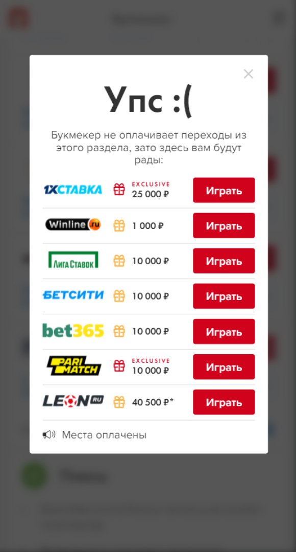 Ссылка на сайт букмекера. Напротив названия компании в любом списке или рейтинге есть кнопка («Играть», «Получить» или «Скачать»), ведущая на сайт соответствующего букмекера. Но при клике на неё пользователь будет перенаправлен, только если БК – наш партнёр. В противном случае – упс. Появляется всплывающее окно со списком тех, кто платит, и предупреждением о рекламе.