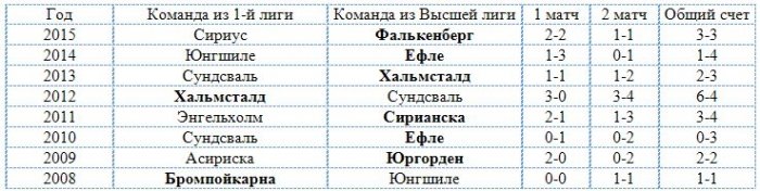 Итак с 2008 года было введено правило для розыгрыша плей-фф за понижени/повышение и что интересно, за эти годы, всего 2 раза команда из высшей лиги не смогла остаться и вылетала. Упомянутые 2 раза как раз приходились на високосные годы 2008 и 2012...Нынче год 2016 и интересно сможет ли Хальмстад продолжить традицию...