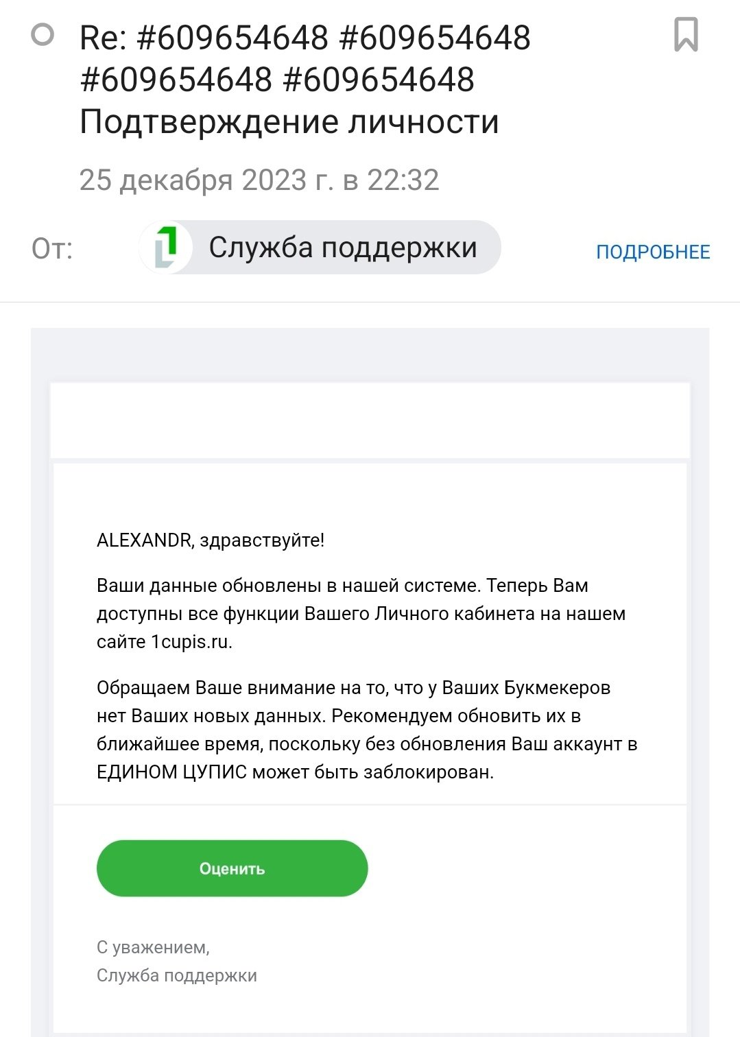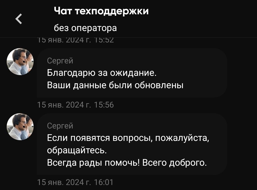И действительно, после предоставления в чат службе поддержки скриншота с сообщением от ЦУПИС об обновлении данных, дело сдвинулось с мёртвой точки: оператор удалился минут на 10-15, после чего заверил, что новые паспортные данные в контору поступили.