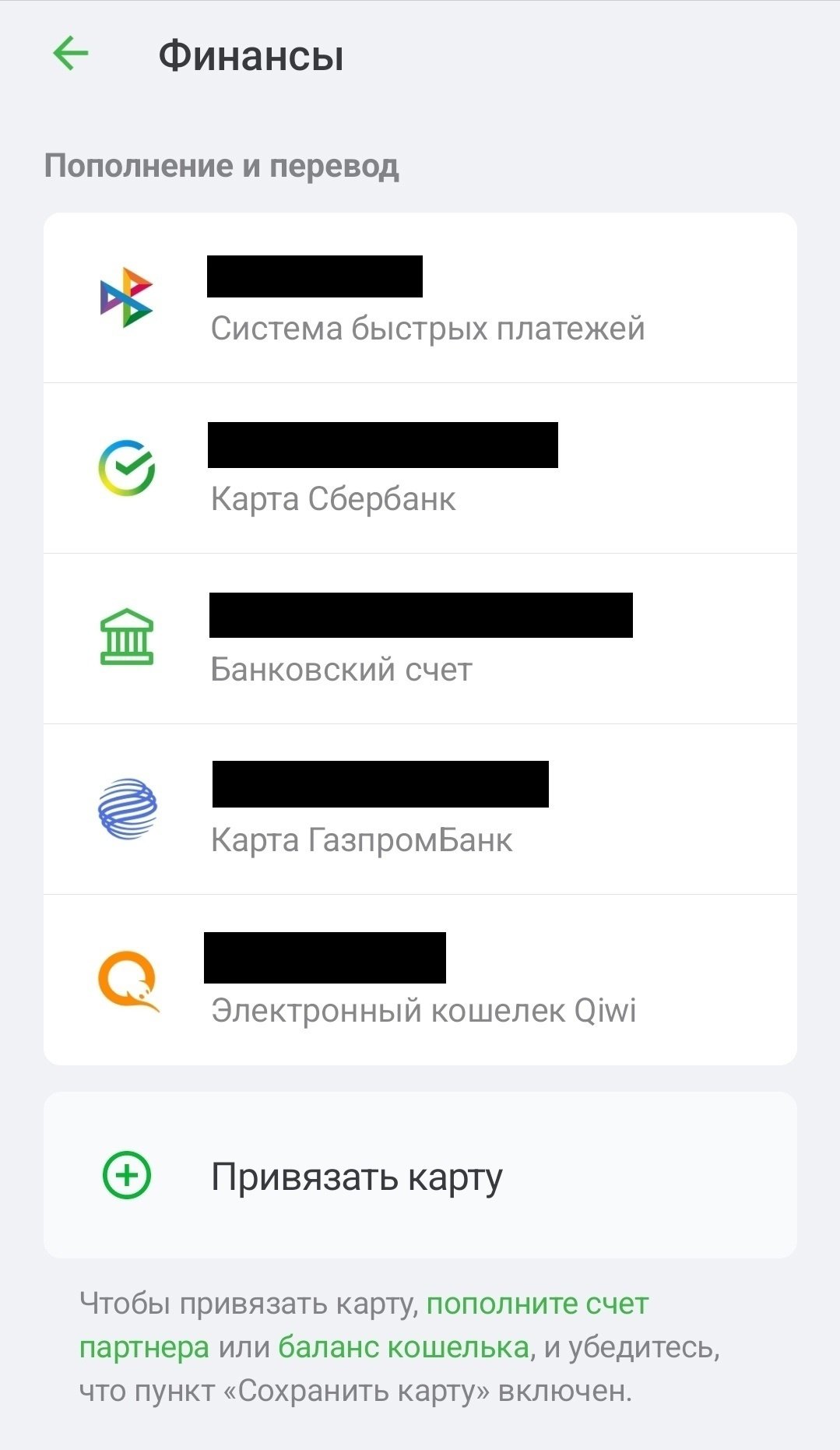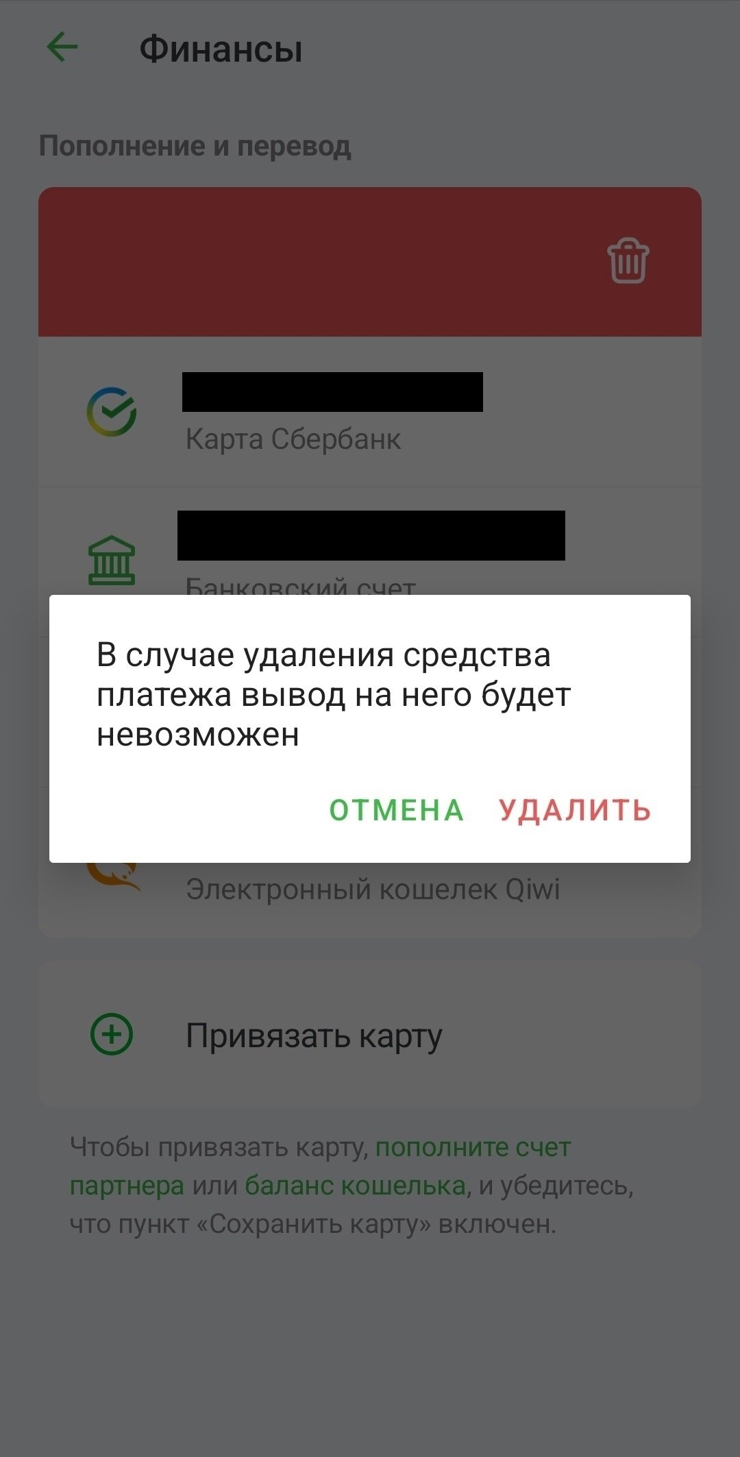 Здесь хранится список всех карт и платёжных систем, привязанных к вашему аккаунту. Для удаления достаточно свайпнуть выбранную карту влево и подтвердить удаление.