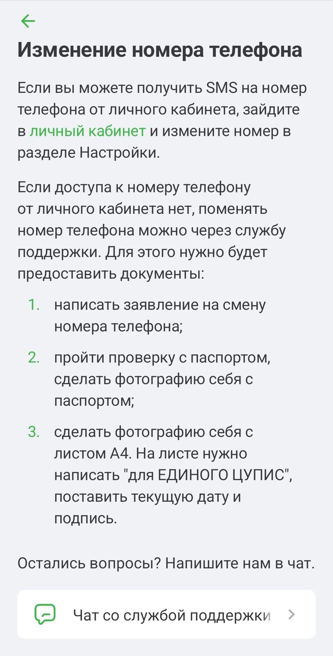 А вот если вы потеряли доступ к старому номеру, то придётся заполнить заявление с номером паспорта и прочими подробностями и отправить его в Единый ЦУПИС, после чего пройти мини-вериф с селфи с паспортом и бумажкой с надписью «для Единого ЦУПИС» и текущей датой.