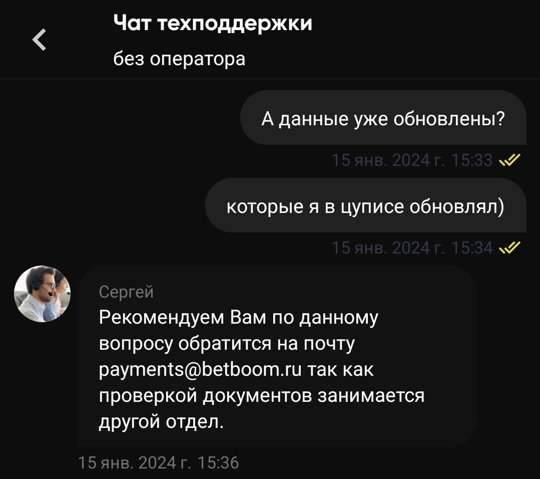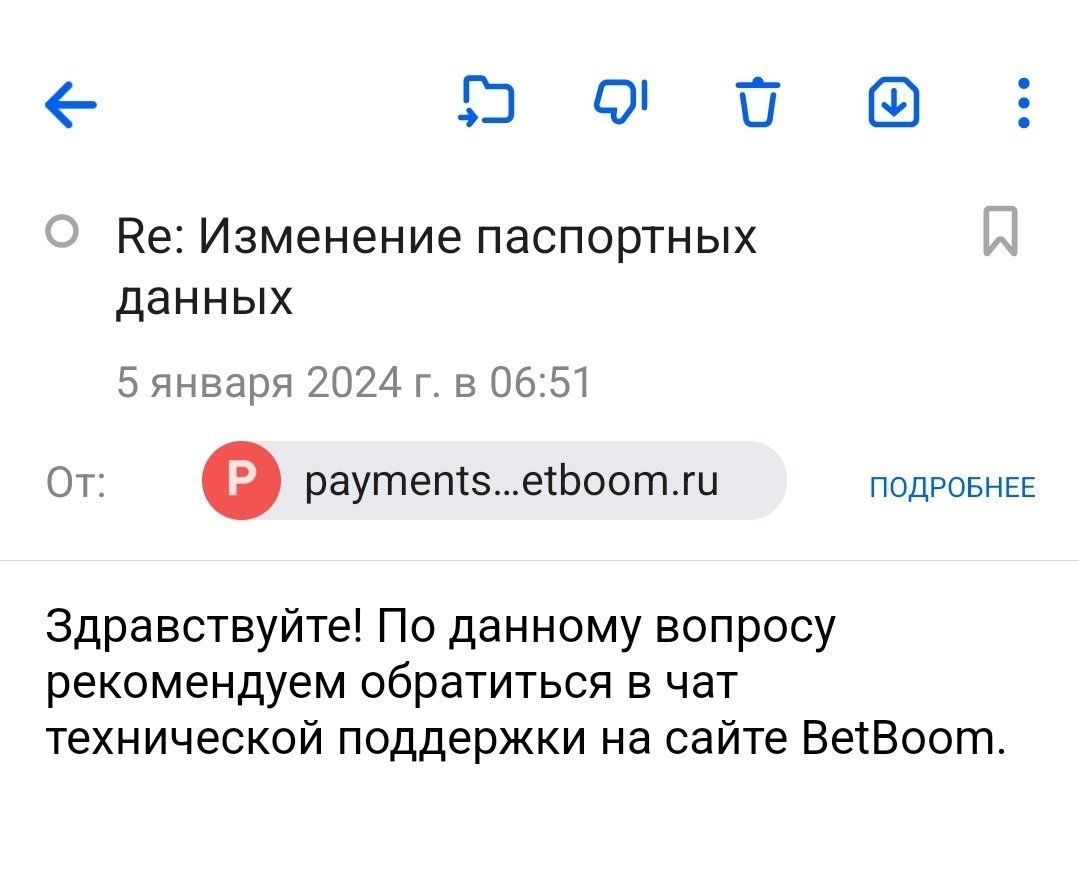Дальше началась небольшая неразбериха: в службе поддержки БК BetBoom посоветовали отправить новый паспорт и остальные документы на указанную почту.