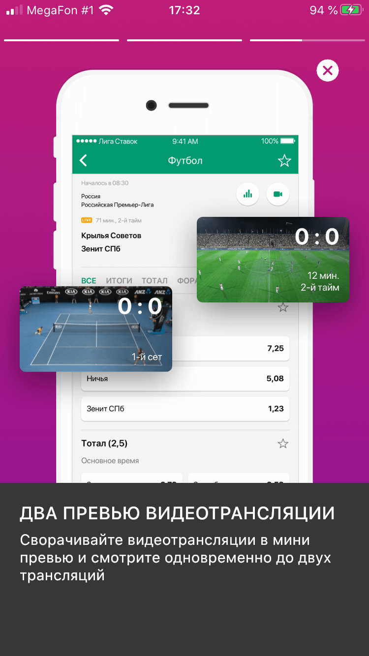 Обновленная система позволяет включать сразу несколько видеотрансляций и переключаться между ними без задержек. Также клиенты БК могут заключать пари, не выходя из трансляции. Видео не будет закрываться или сворачиваться, если вы перейдете с одного экрана приложения на другой.