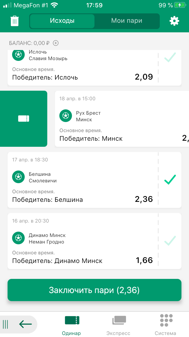 Одним движением пальца теперь можно оформлять «ординары» на любом экране приложения, а также комбинировать исходы в купоне, составляя «экспрессы». Кроме того, можно разбить «экспресс» на «ординары» прямо в купоне и выбрать для ставки один из них, если игрок передумал ставить на несколько исходов сразу. Также после обновления стала доступна функция приема изменений коэффициентов, актуальная в случаях проседания или роста линии.