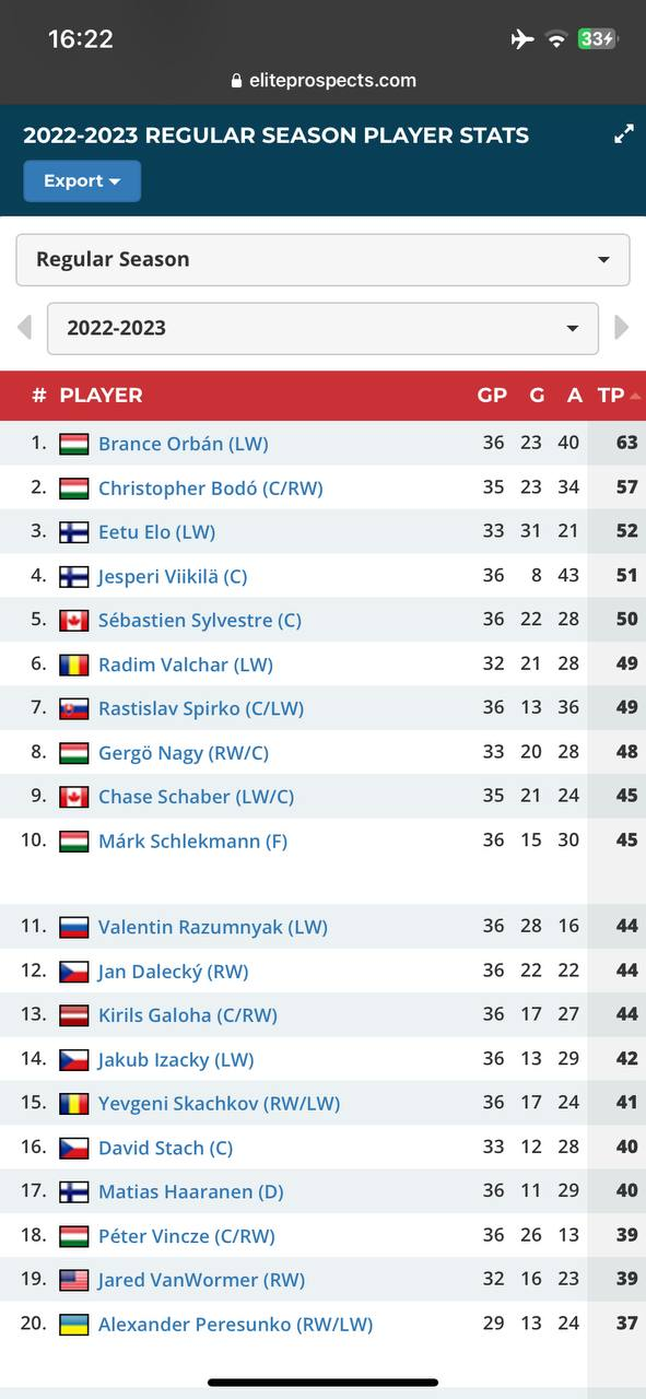 Лучшие игроки венгерского чемпионата — ноунеймы, которые толком никогда не играли в топ-дивизионах своих стран. Россиянин Валентин Разумняк, ставший 11-м бомбардиром с 28+16 за 36 игр, провёл 3 матча за «Салават» в сезоне-2015/16 и никогда не набирал больше 18 очков за сезон в ВХЛ.