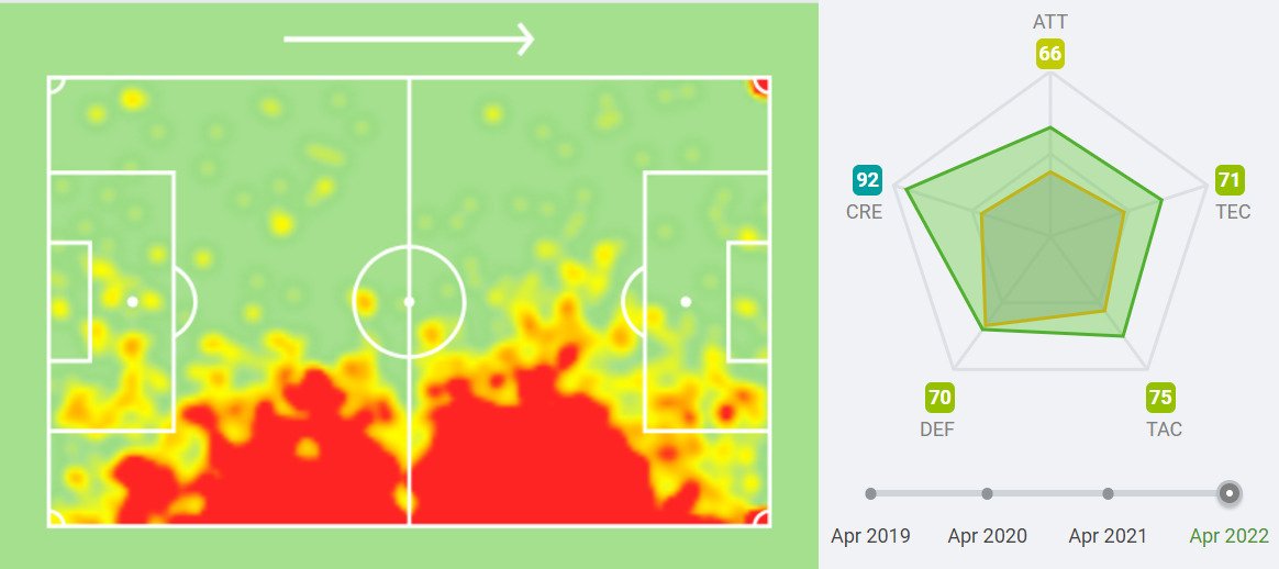 Роль Трента вышла за рамки классического бегунка — теперь его можно назвать полноценным полузащитником (кстати, за сборную Англии он уже играл в полузащите в этом сезоне). Наглядно увидеть трансформацию можно по этой картинке, чтобы понять, насколько защитник ЭВОЛЮЦИОНИРОВАЛ. Ну и тепловая карта как показатель его положения на поле.