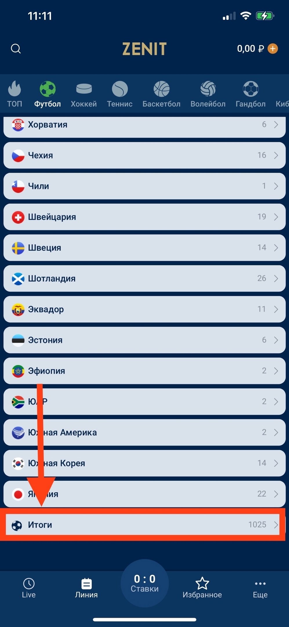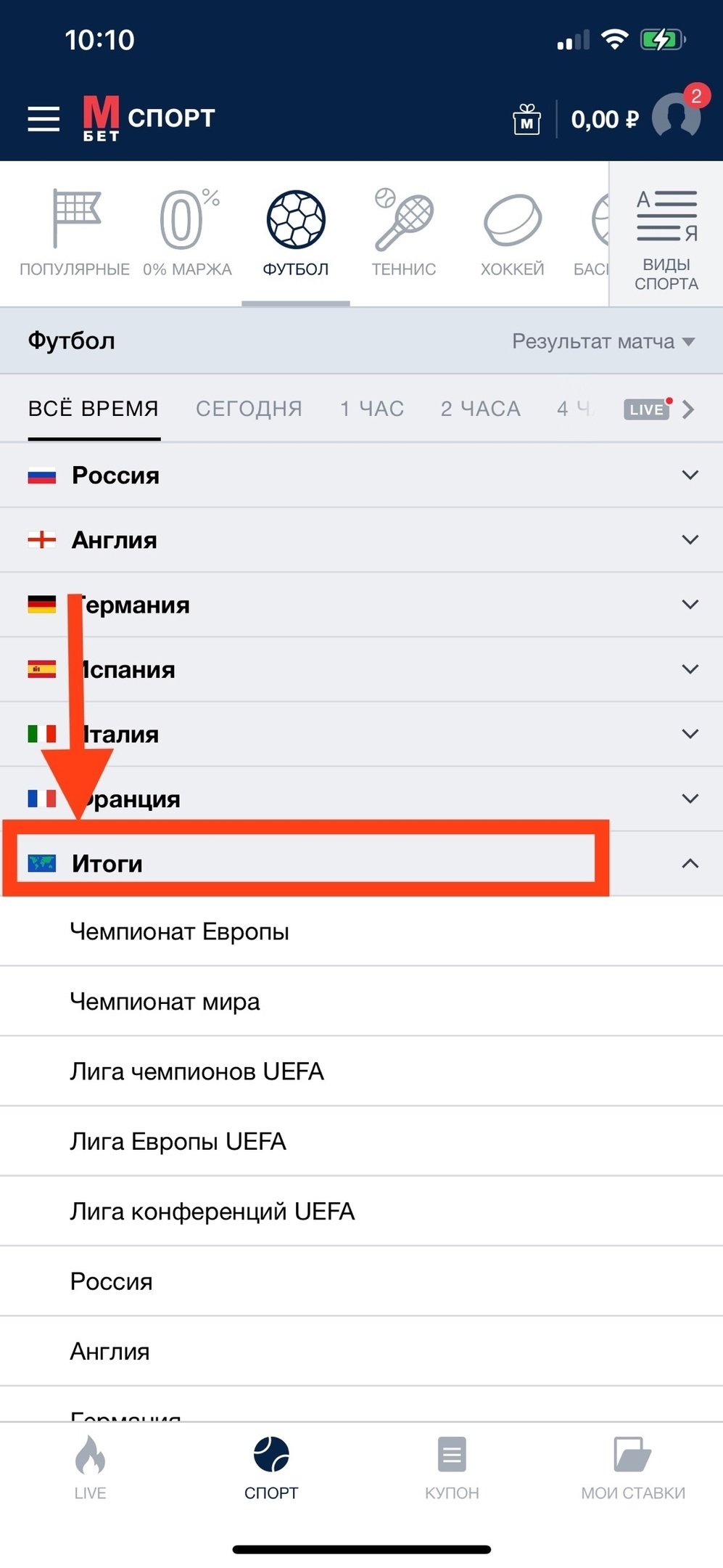 В БК «Марафон» долгосрочные ставки находятся в отдельной вкладке для каждого вида спорта, называется она «Итоги». А вот внутри неё уже есть разделение на страны и турниры. В общем, навигация довольно простая, хоть и непривычная.