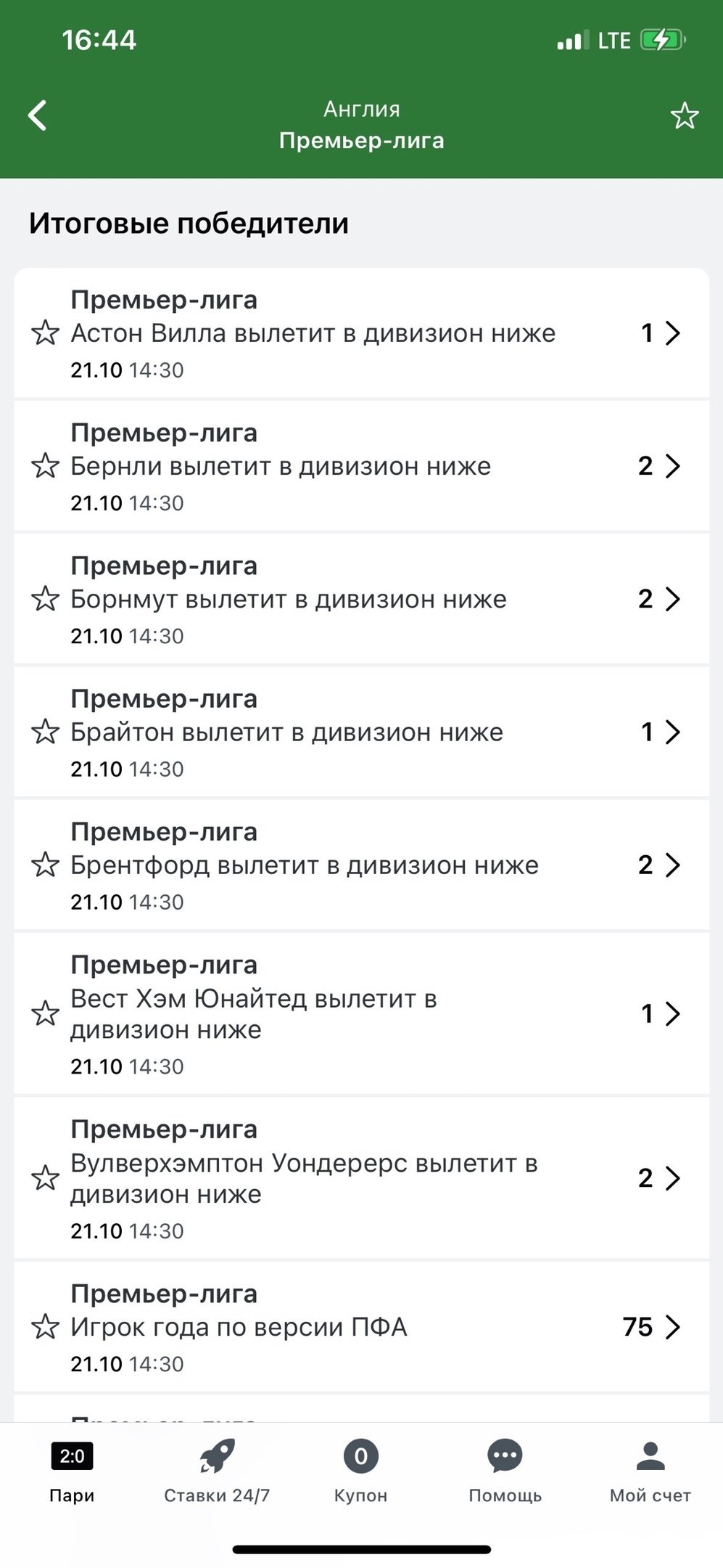 Пускай вас не смущает подпись «Итоговые победители», там достаточно большой список разных пари. Есть и ставки на вылет, и на победу без учёта команды-фаворита (или всей большой шестёрки АПЛ, к примеру), и самые разные вариации «Кто выше». Причём линия довольно подробная на все основные виды спорта.