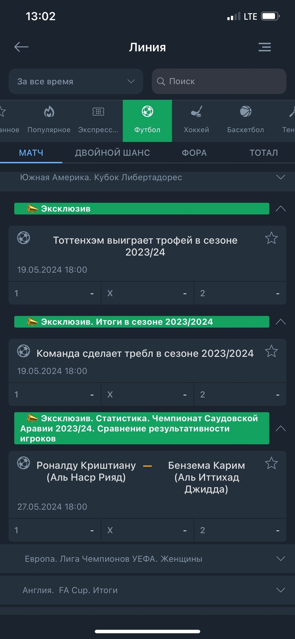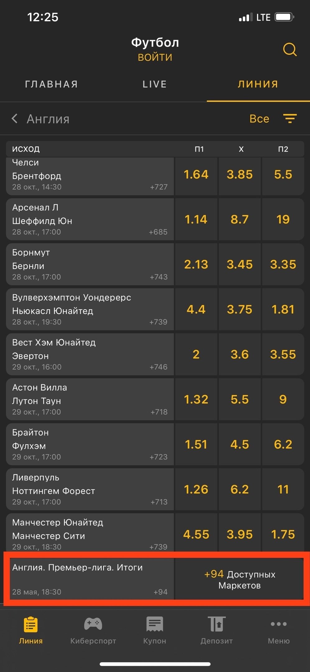 По-настоящему эксклюзивной ставкой в Winline можно назвать разве что пари на лучшего игрока АПЛ по версии PFA Ассоциация профессиональных футболистов Англии. Но нельзя не отметить сочные линии на североамериканский спорт — правда с началом сезона некоторые рынки, например тоталы побед в НХЛ, пропадают, а их обновление идёт довольно долго. Зато на НБА до сих пор есть выход в плей-офф, и тоталы побед, и индивидуальные награды.