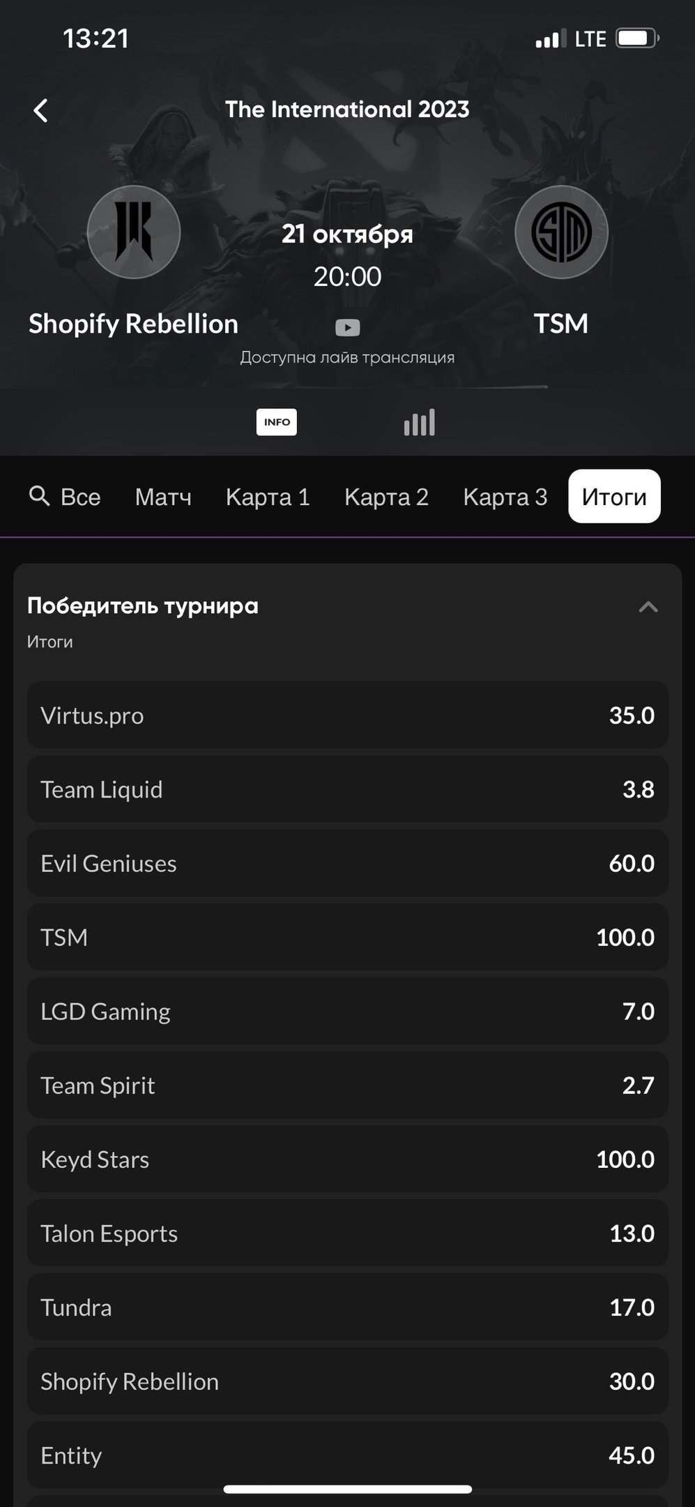 Теперь главная странность — это итоги на киберспорт. Даже на The International после начала убрали отдельную вкладку с долгосроками, найти их можно только после перехода к конкретному матчу. А в день проведения игр итоги снова уходят на обновление. Не очень круто придумано для БК, которая огромное внимание уделяет киберу.