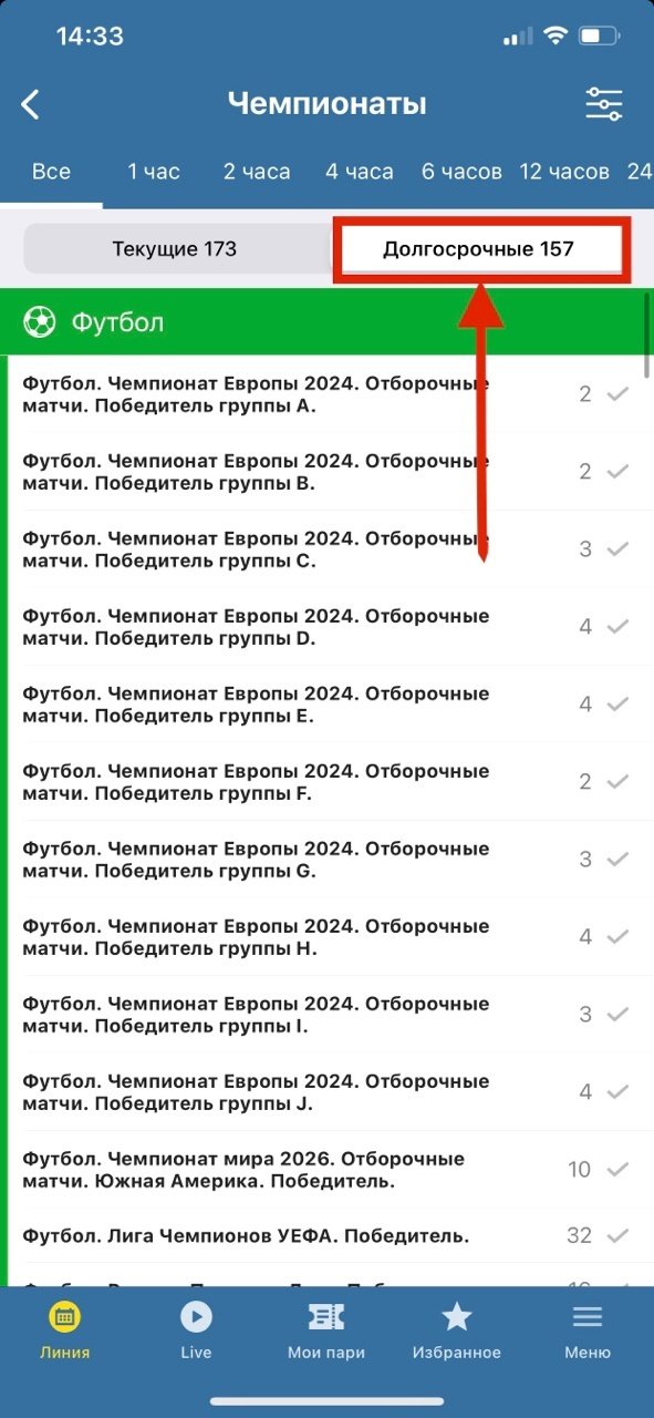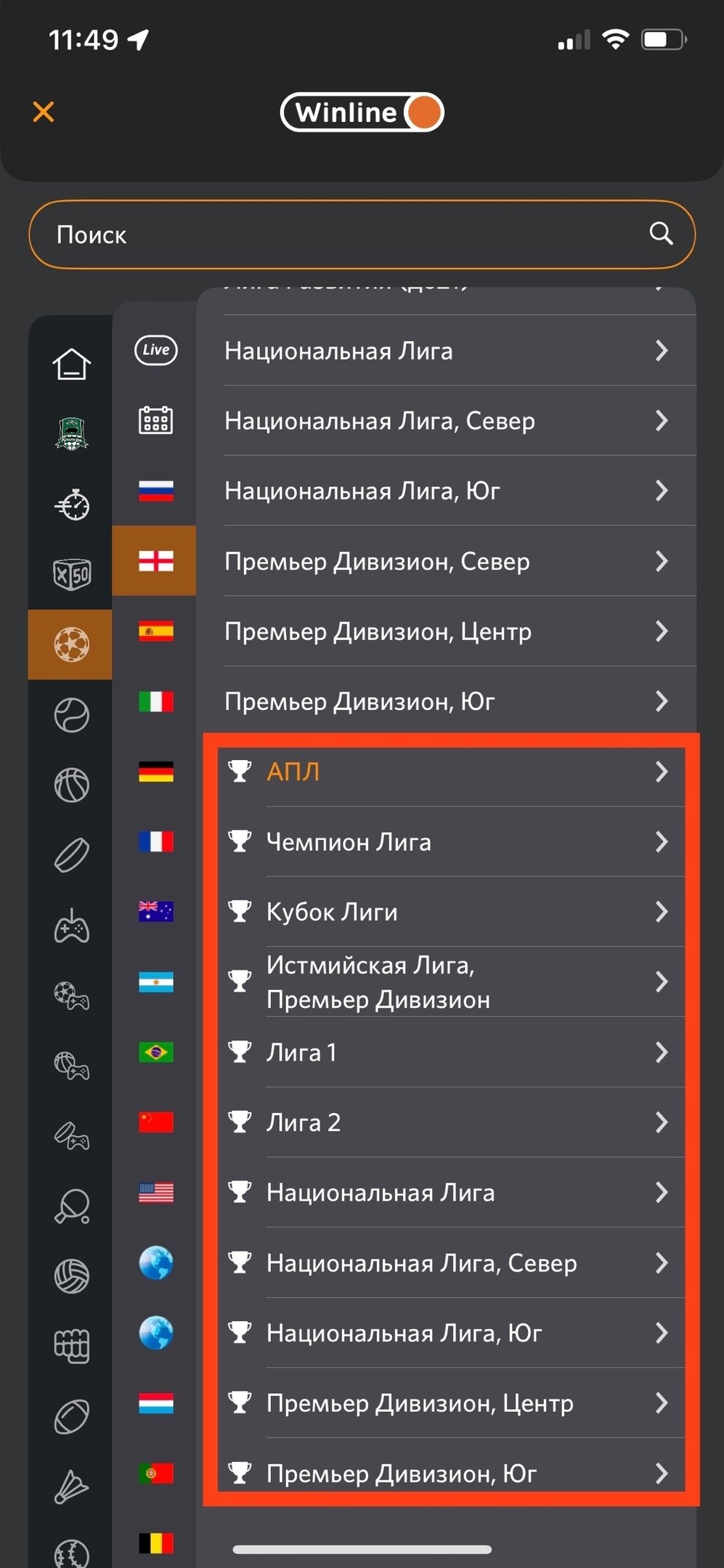 Ставить на долгосроки можно только через мобильное приложение букмекера, на сайте их просто нет. Так что открываем приложуху, заходим в меню и выбираем вид спорта и страну. Названия турниров с кубком справа — это и есть долгосрочные ставки на них.