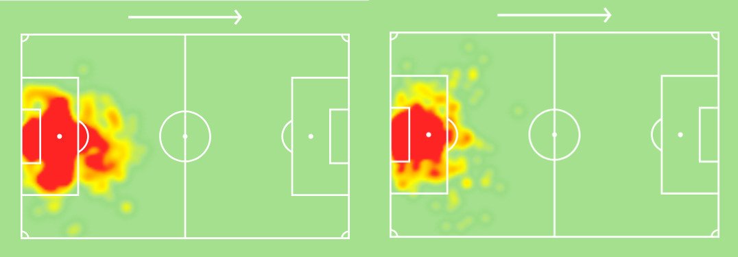 Тепловая карта Алиссона Беккера (слева) и Доннаруммы (справа) для того, чтобы лучше понять, как играют топовые вратари мира и как играет итальянец. Понятно, кто тут помогает защитникам: