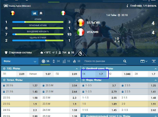 Из примеров рассылки — матч на Евро Италии и Бельгии. Вторые до игры шли фаворитом по фолам с кэфом 1.45, и это плюс-минус верно (скрин прилагаю), но стоило итальянцам забить, как котировки выровнялись.